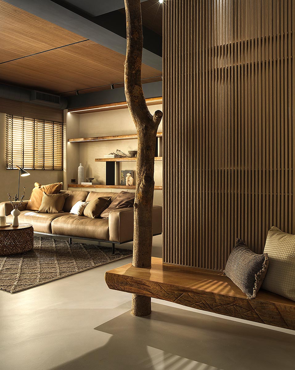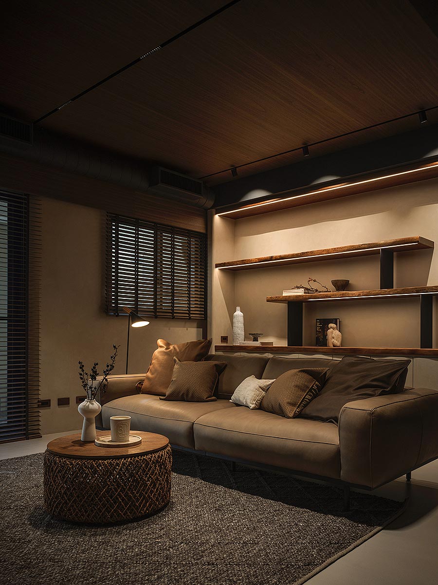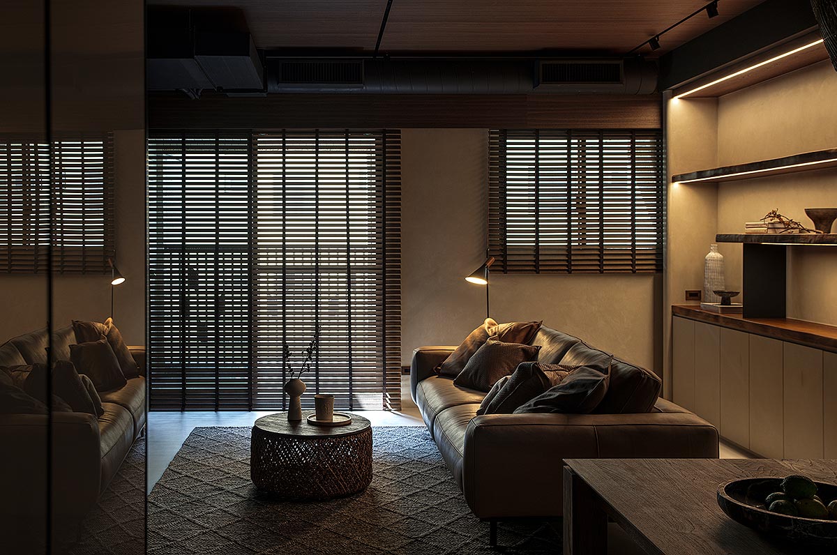 全屋地坪更挑選了 PANDOMO 材質,不僅增強了行走的舒適度,還能使日常清理維護更為便捷。整體空間不過多雕琢,而是著重材質自然紋理和光影變化,流轉的空間動線自然而然,使住客能在純粹的氛圍中倍覺溫馨。此地不只是居所,更是讓人放慢步調並靜心體悟的場域,致使每一次歸來都是最溫柔的片刻。