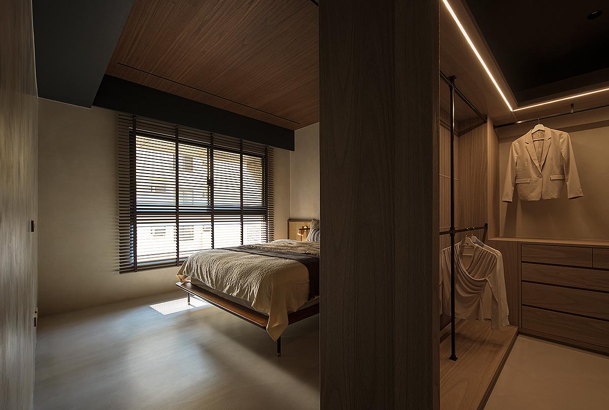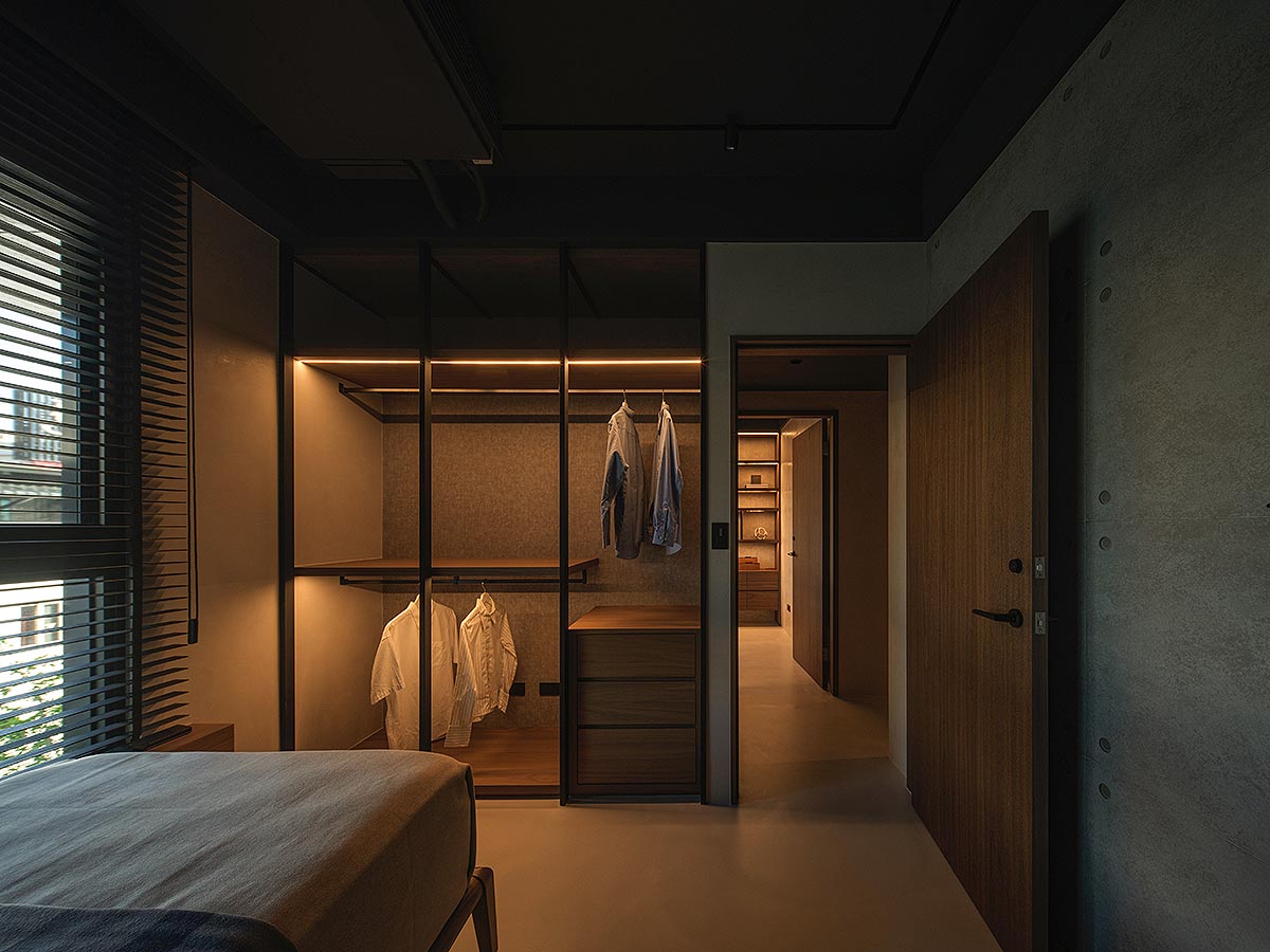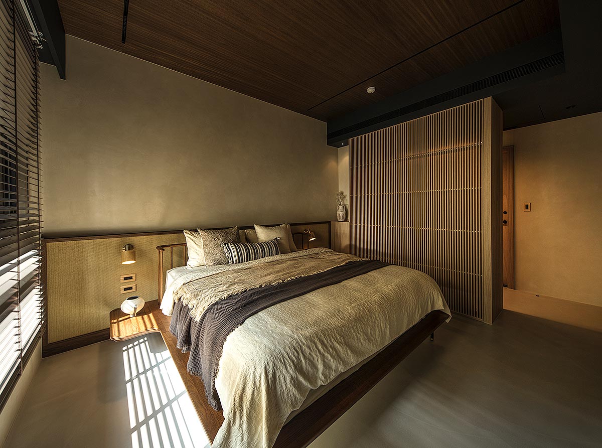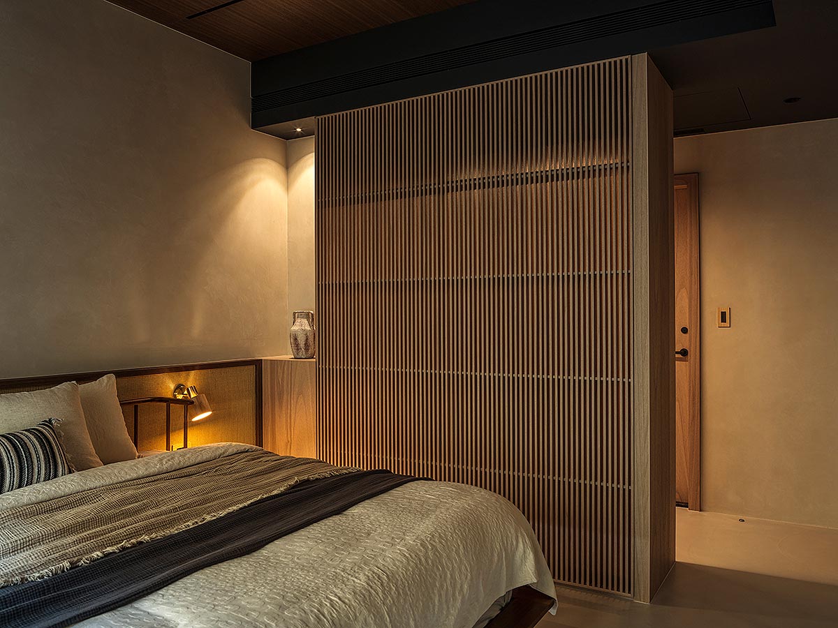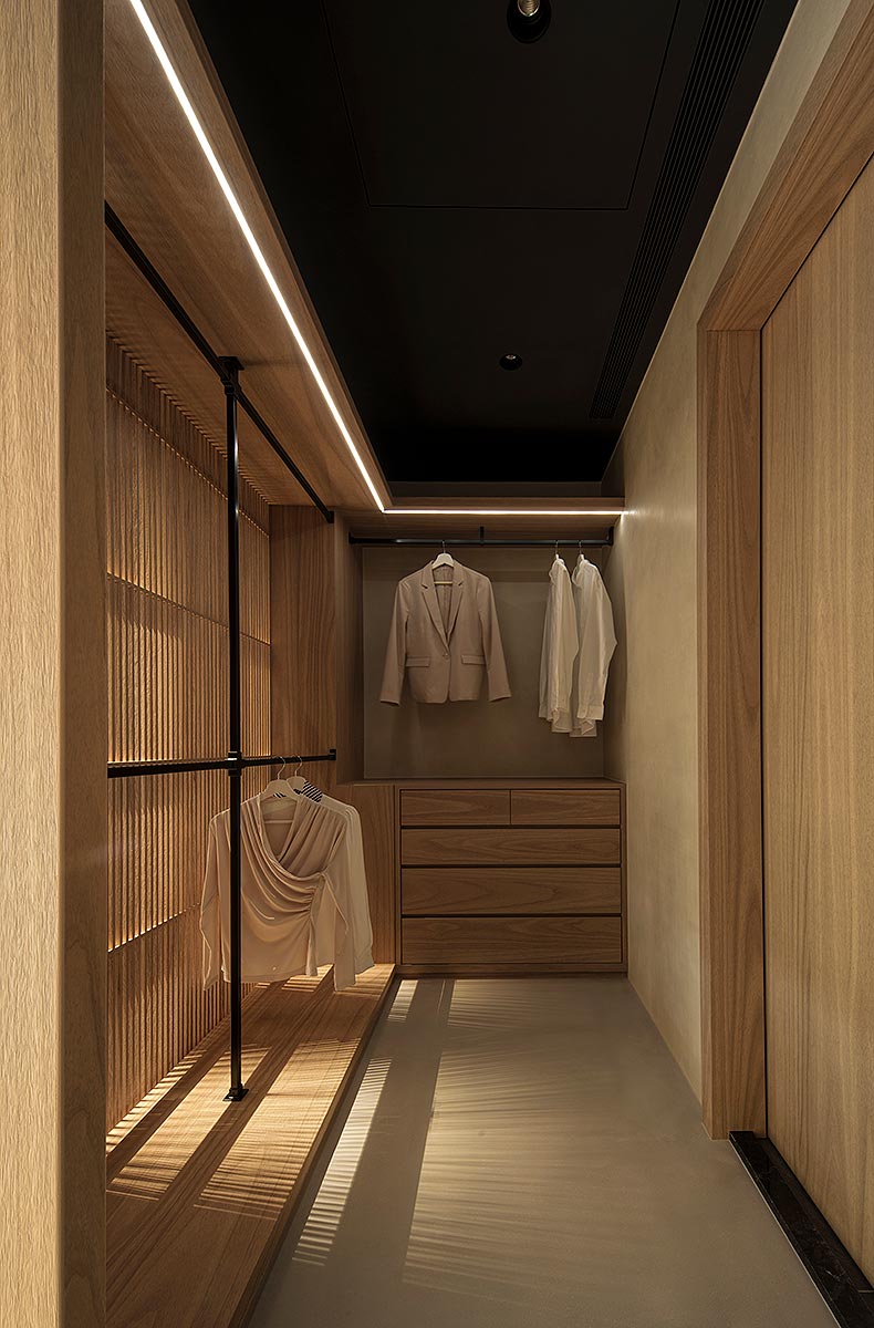 私領域延續了客廳的寧靜與溫煦,男孩房以清水模的獨特紋理銘刻時間的印記,讓生活的痕跡和空間得以交互共生;女孩房的更衣間注重木格柵設計,使得收納具備實用性和美學元素,每件衣物都能井然有序地陳列擺放,回到家時,映入眼簾的即是最自然舒適的陳設。