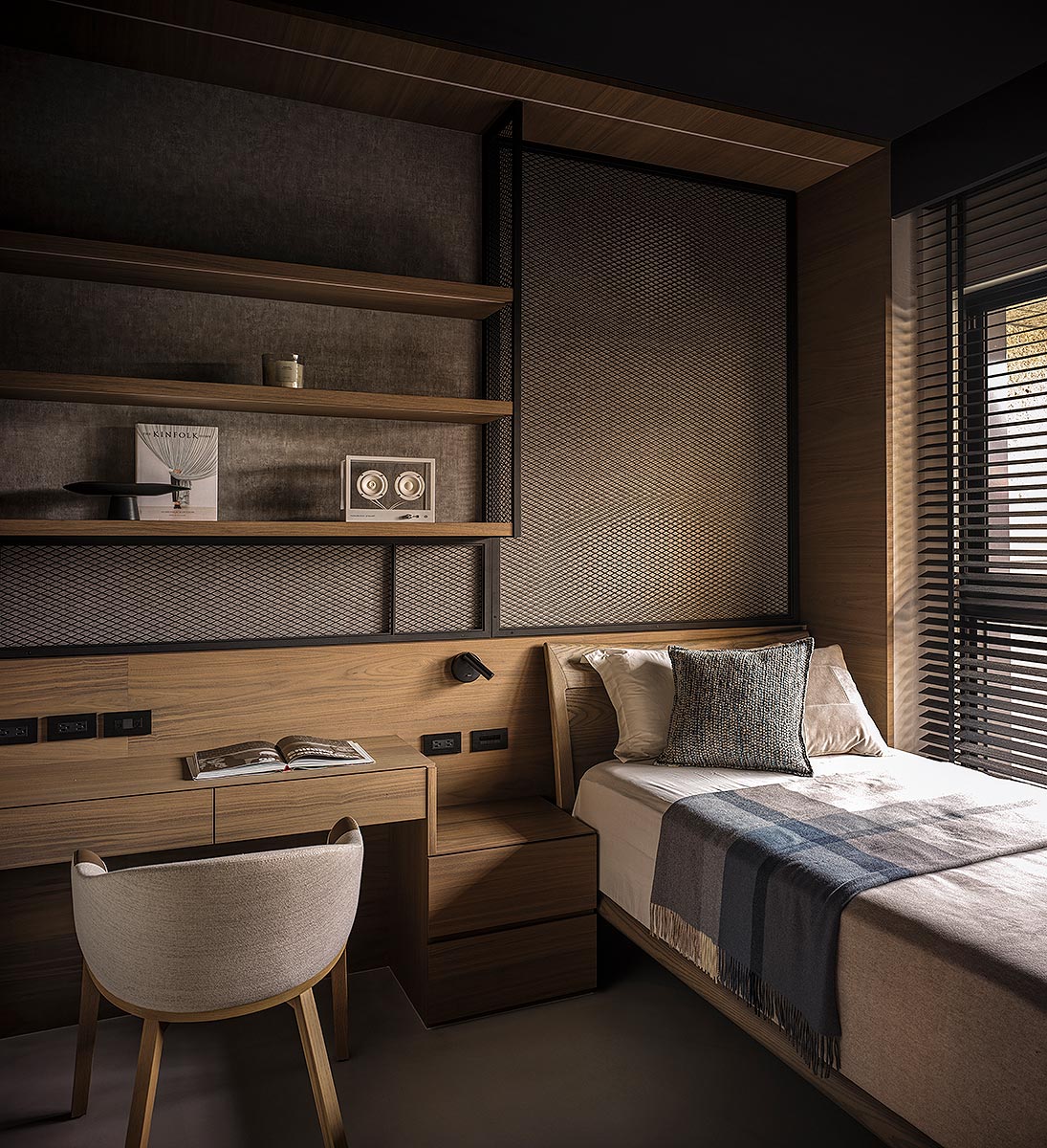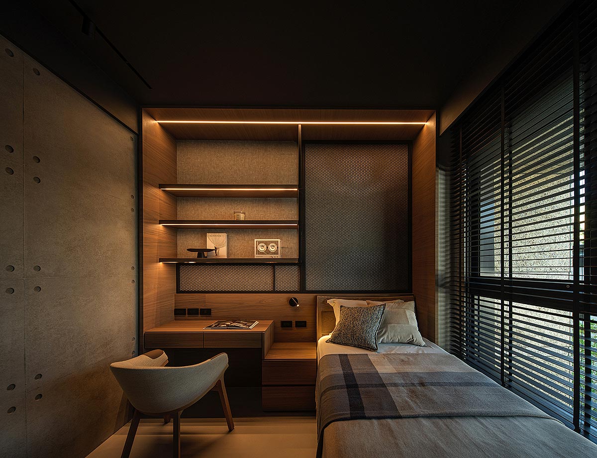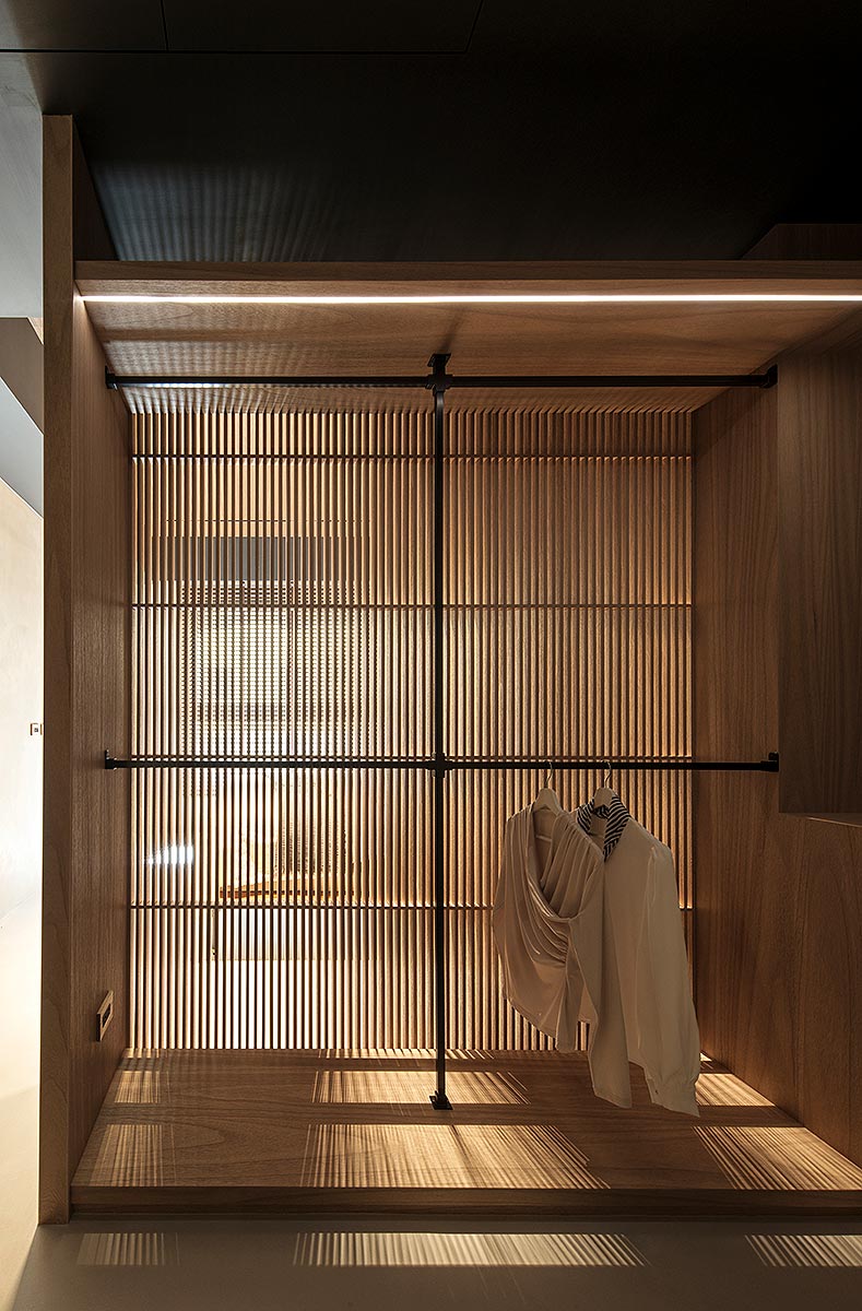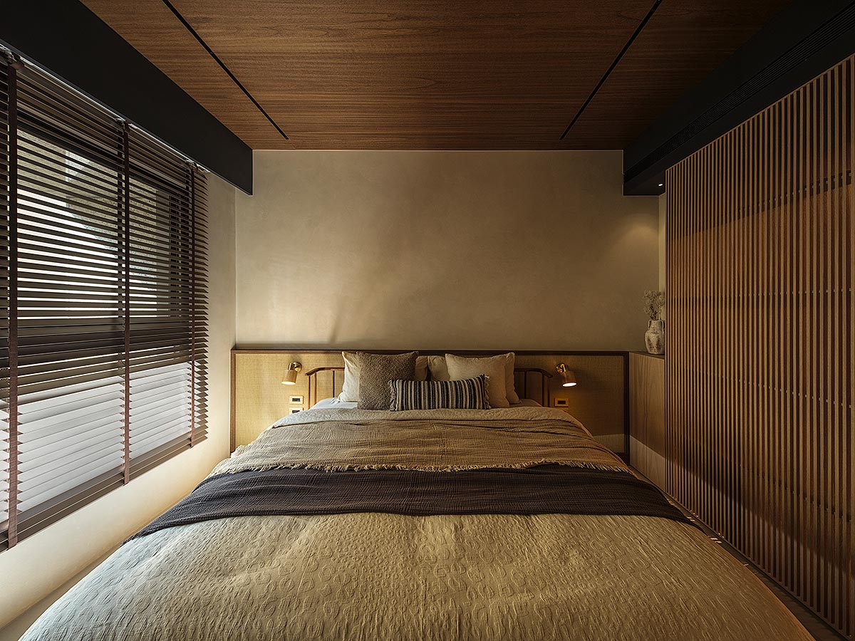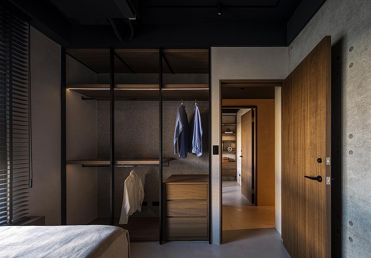 私領域延續了客廳的寧靜與溫煦,男孩房以清水模的獨特紋理銘刻時間的印記,讓生活的痕跡和空間得以交互共生;女孩房的更衣間注重木格柵設計,使得收納具備實用性和美學元素,每件衣物都能井然有序地陳列擺放,回到家時,映入眼簾的即是最自然舒適的陳設。
