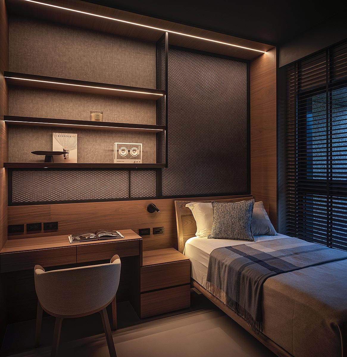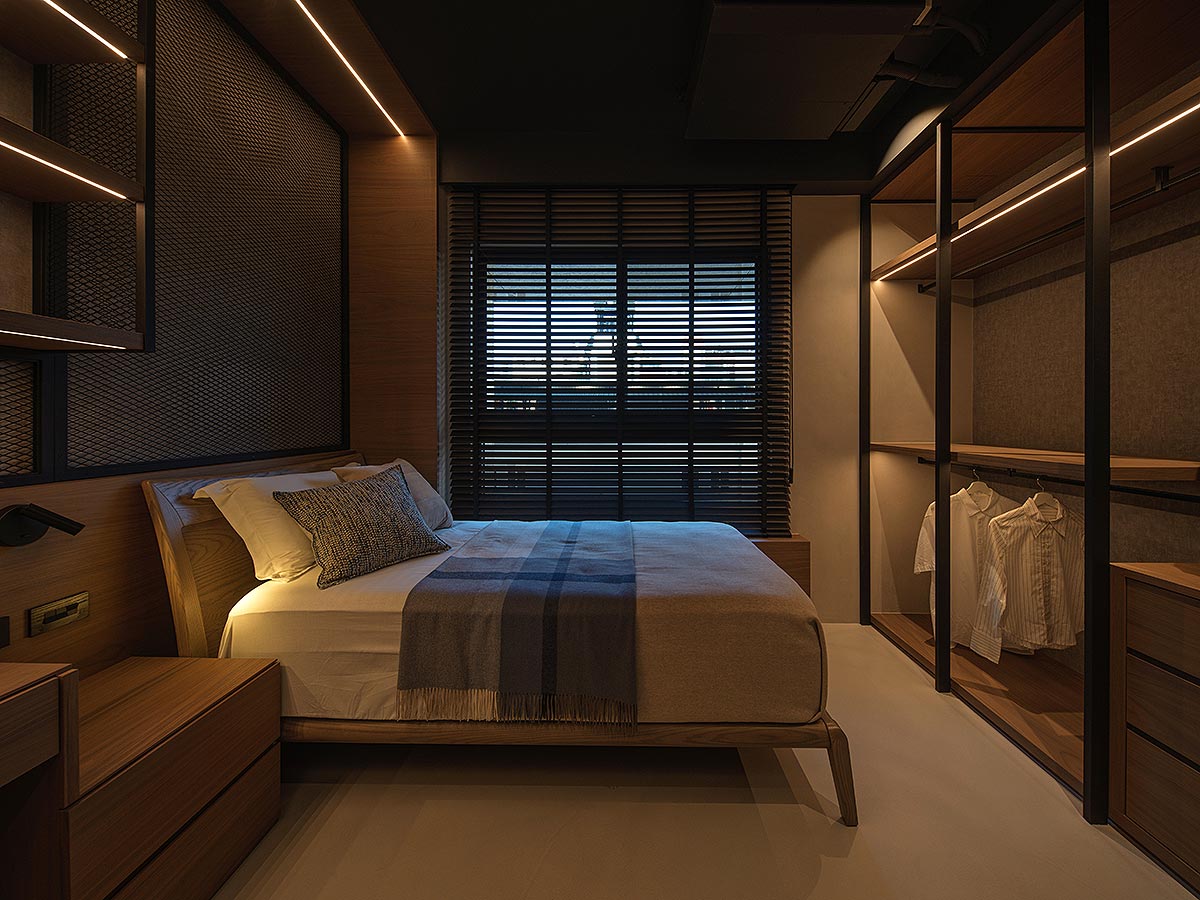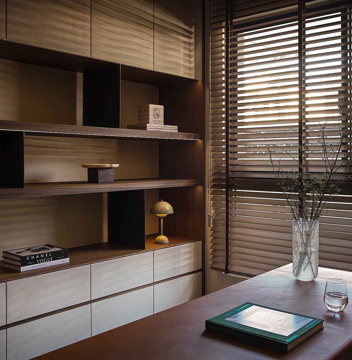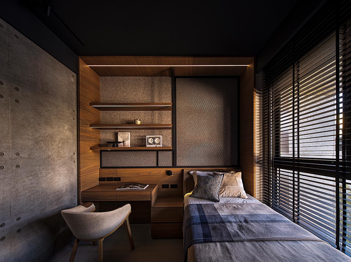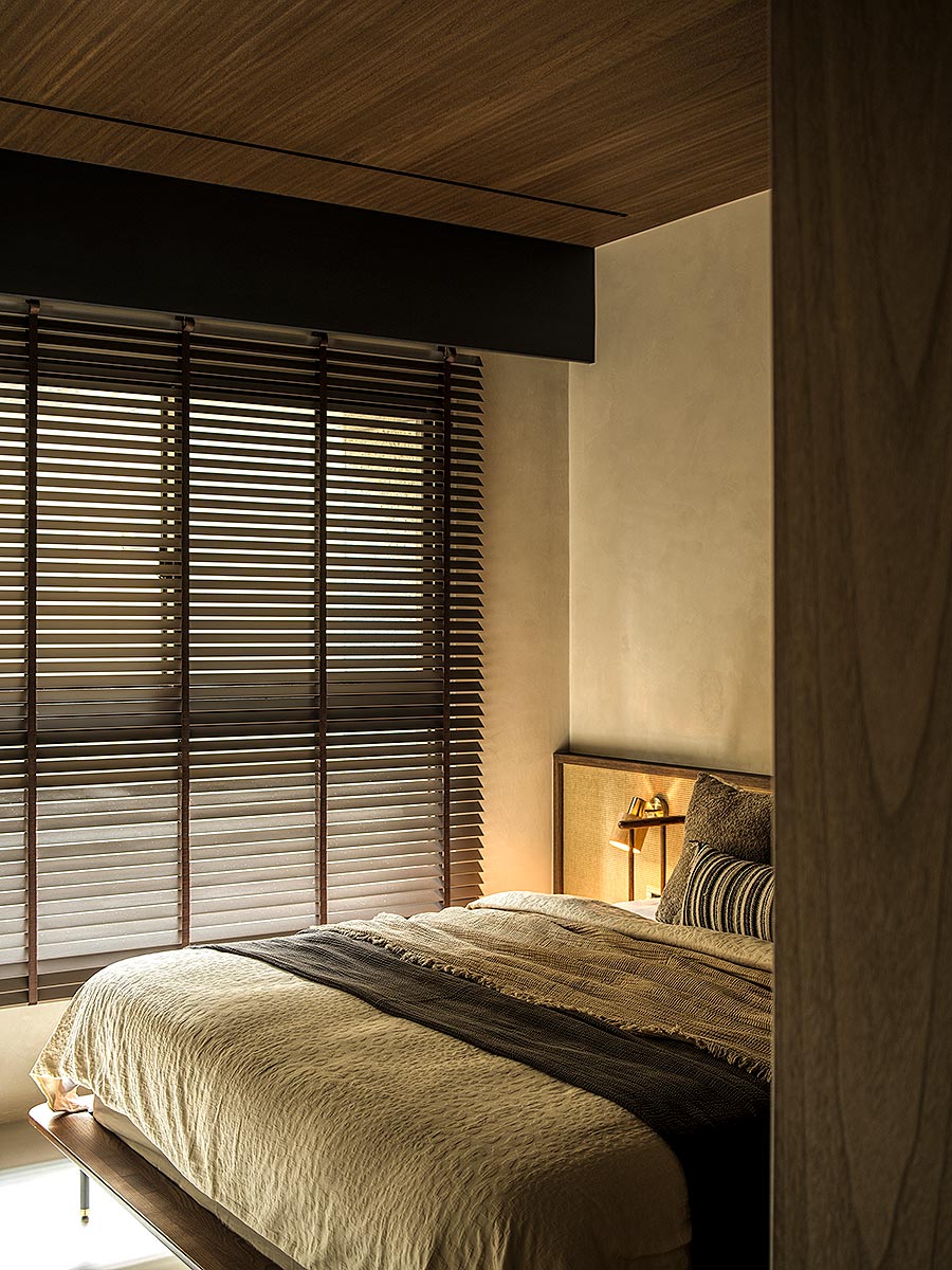 私領域延續了客廳的寧靜與溫煦,男孩房以清水模的獨特紋理銘刻時間的印記,讓生活的痕跡和空間得以交互共生;女孩房的更衣間注重木格柵設計,使得收納具備實用性和美學元素,每件衣物都能井然有序地陳列擺放,回到家時,映入眼簾的即是最自然舒適的陳設。