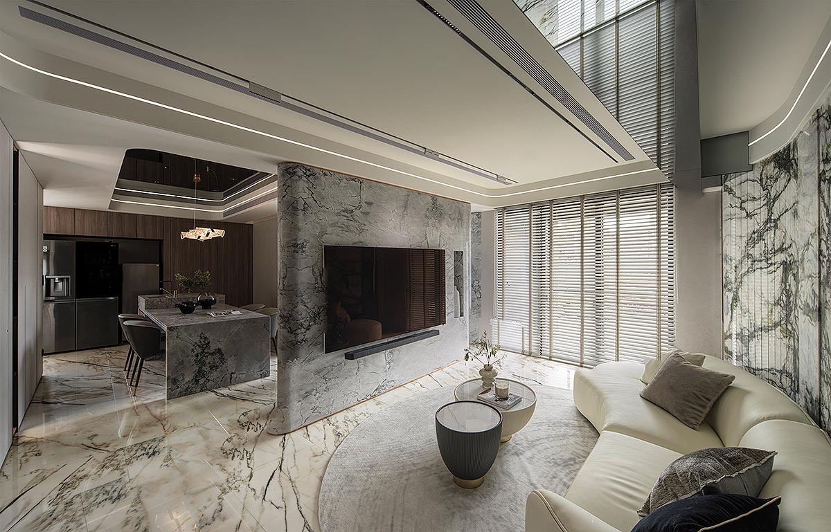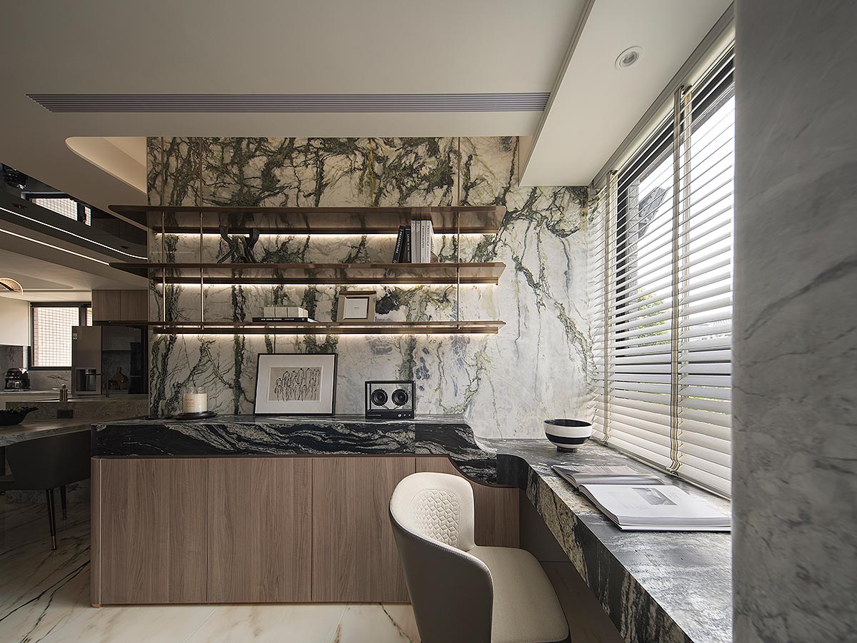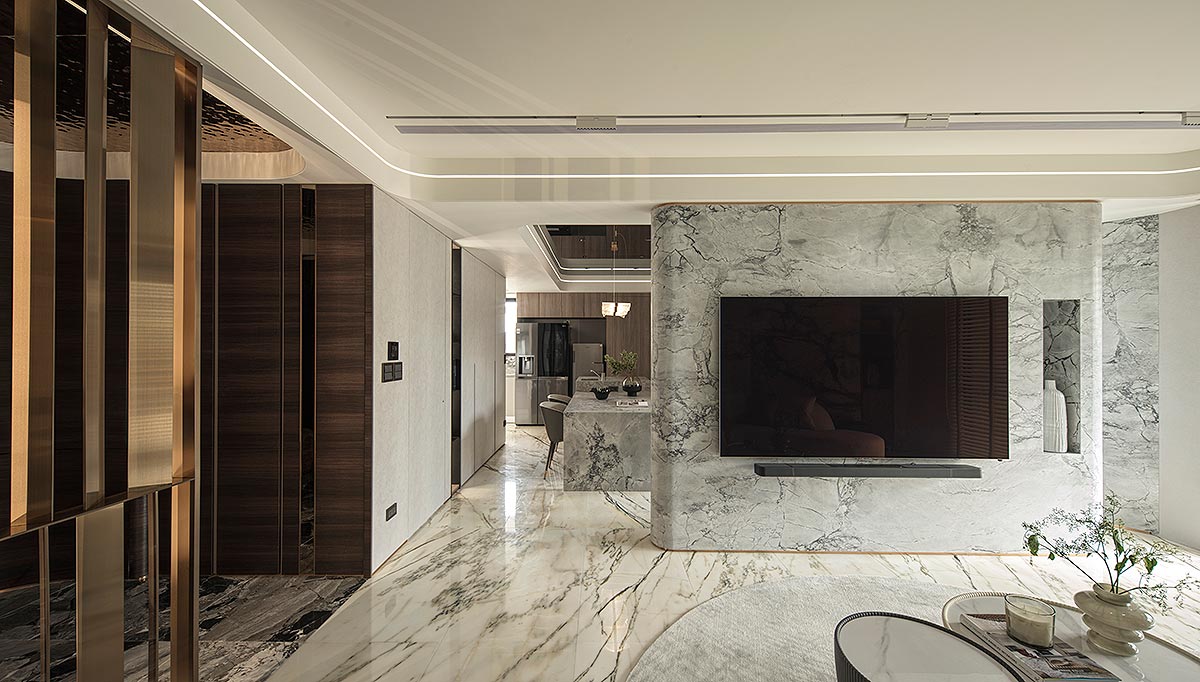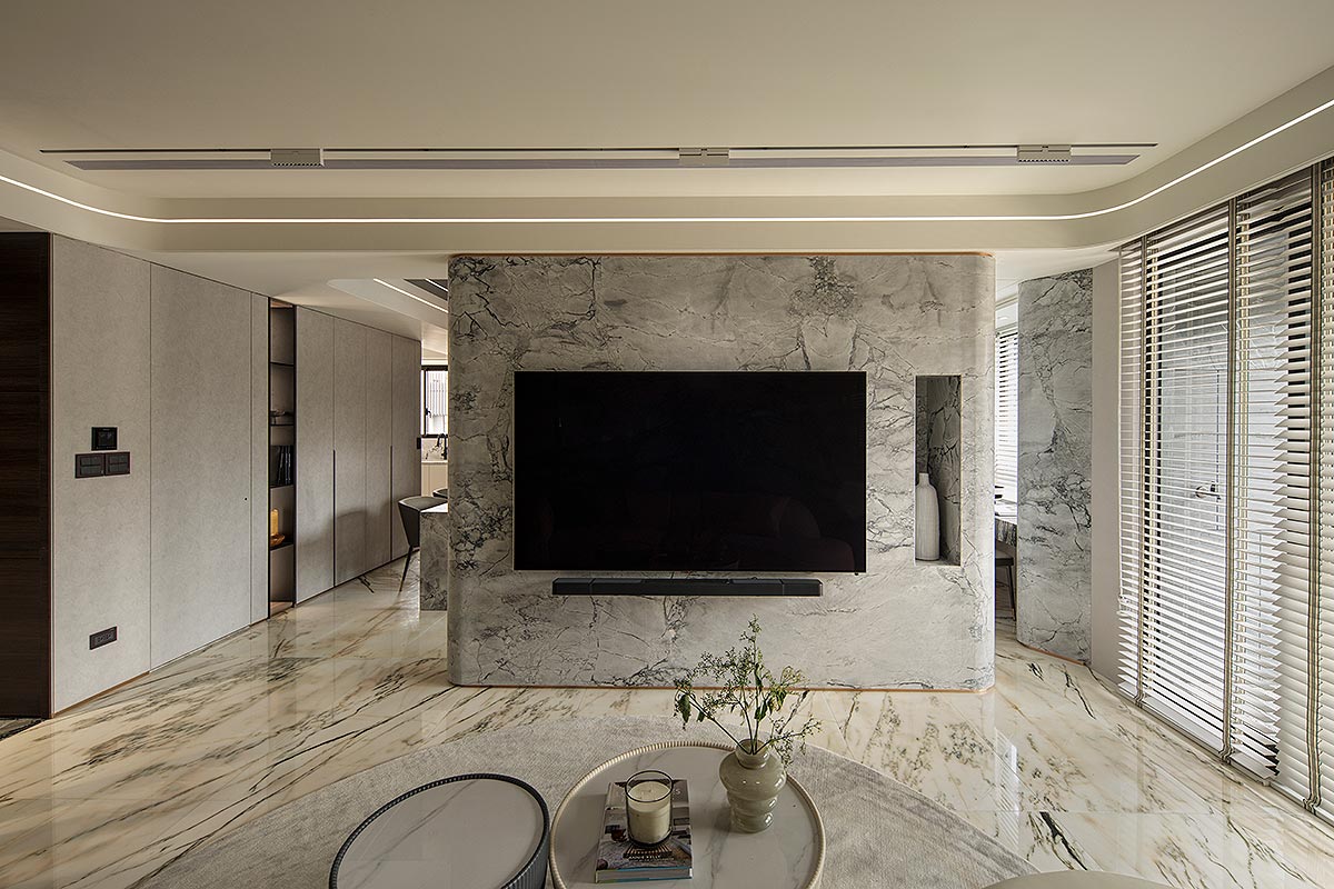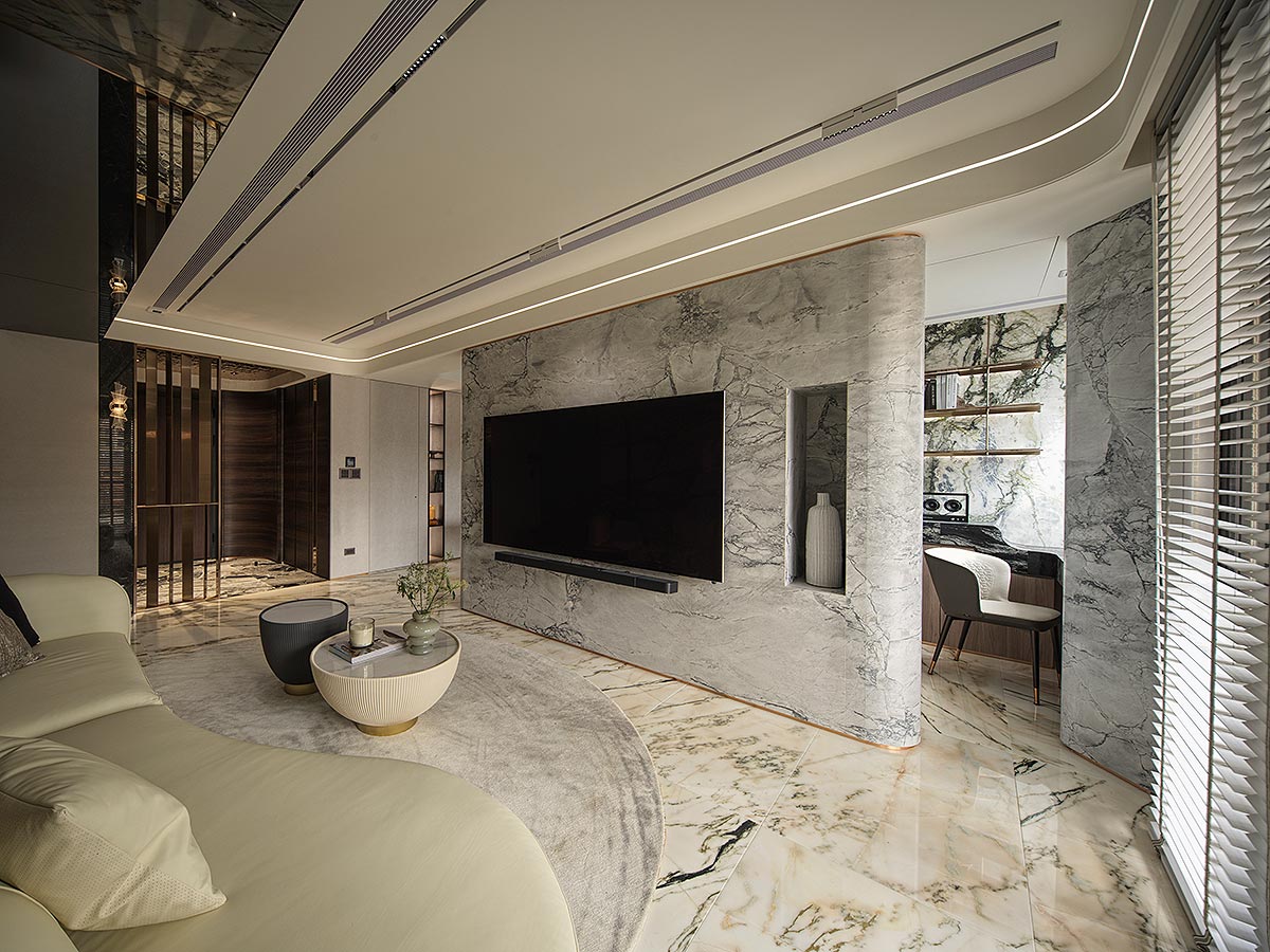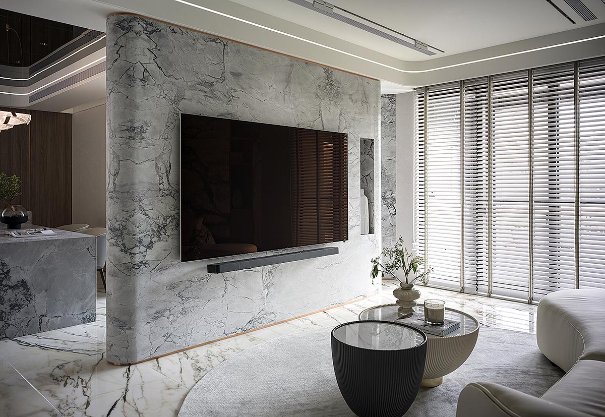 步入廳區,視線隨即被如山水畫般的大理石主牆深深吸引。為了平衡石材的份量感,我們以「石英石」打造電視隔牆,並用「柔弧」收邊化解銳角,讓氣勢成為安定,而非距離;這道圓潤的牆體不僅是視覺焦點,也巧妙整合了機能:一面收藏影音娛樂,一面安放微醺佳釀與談笑的時刻。