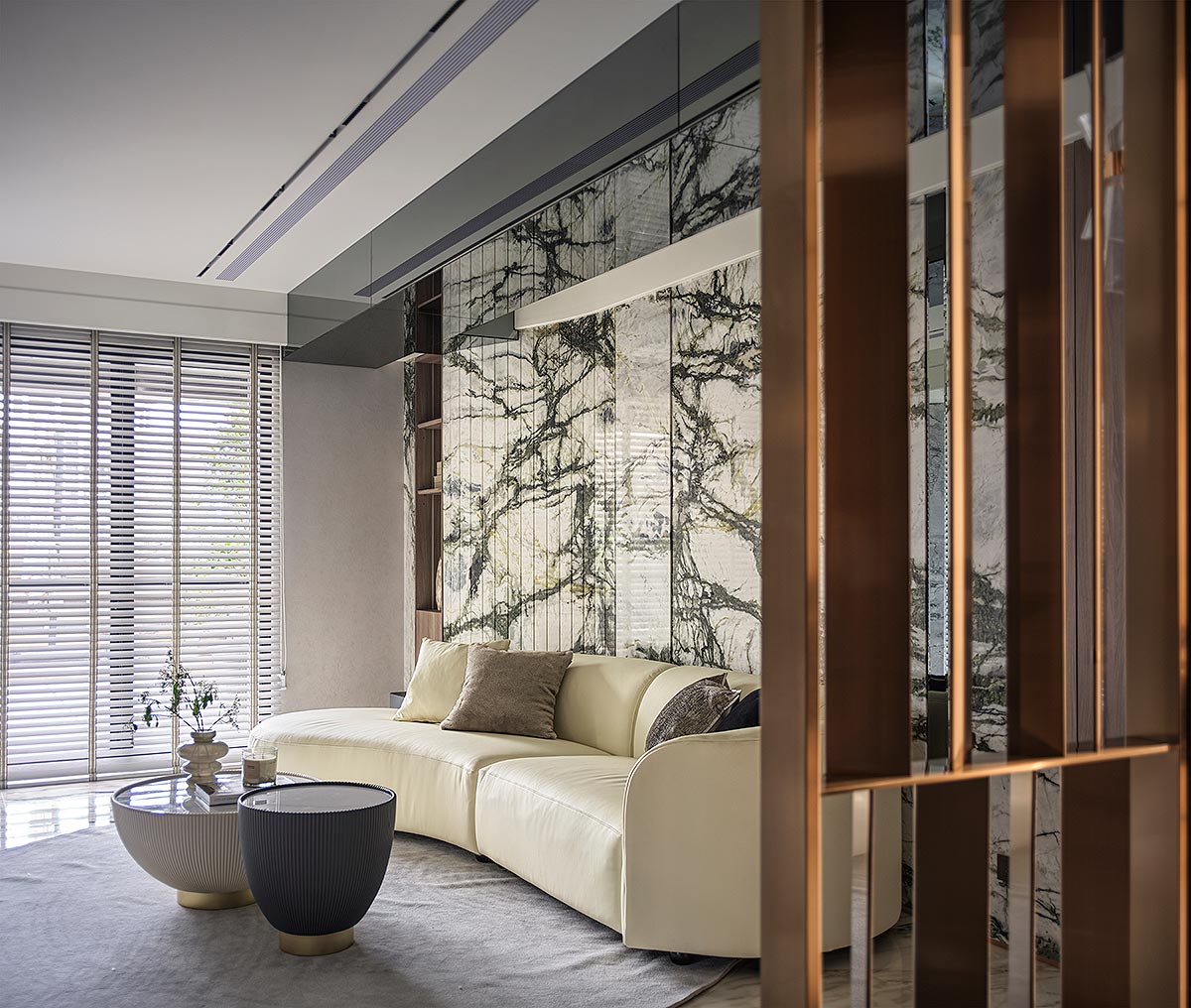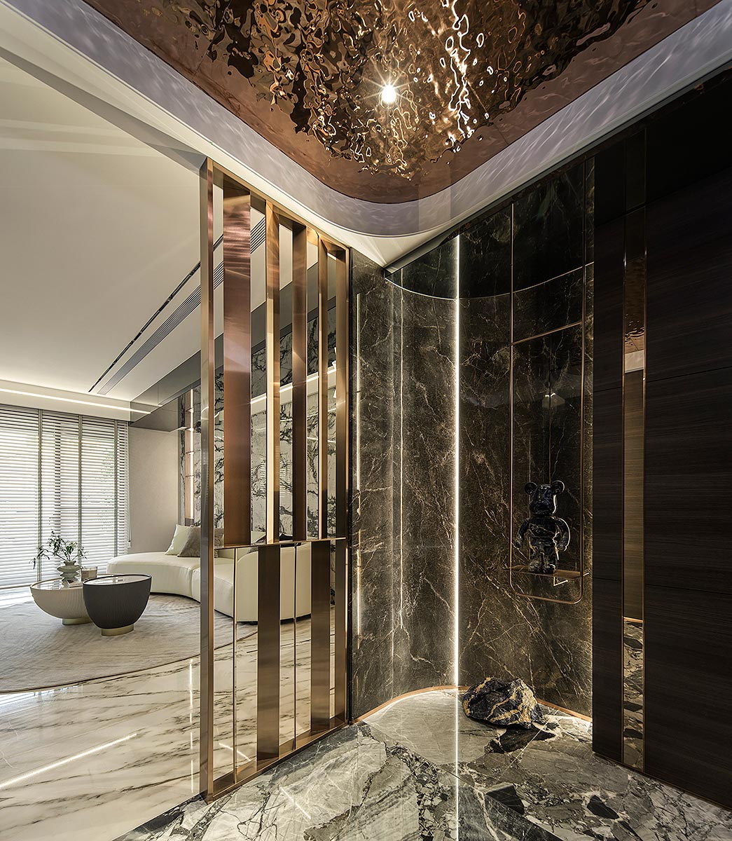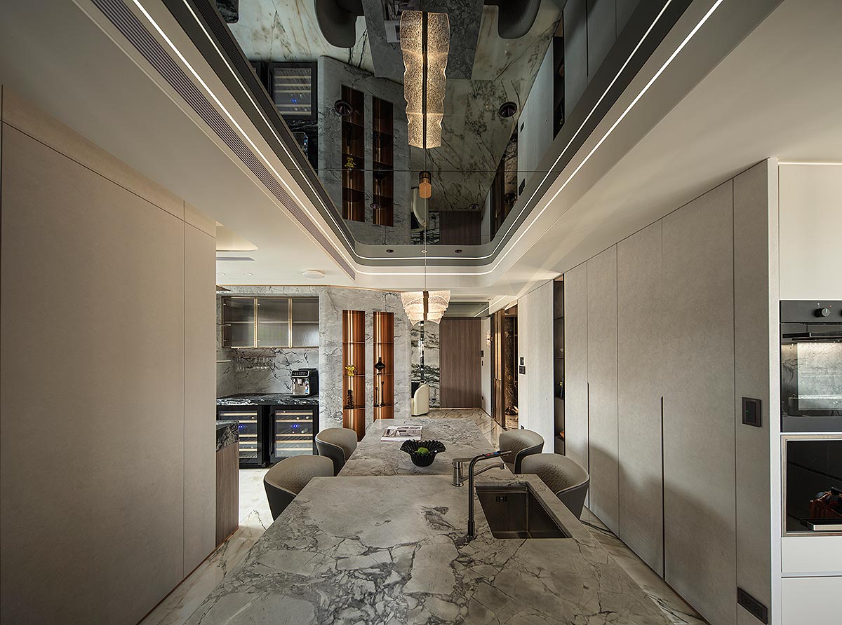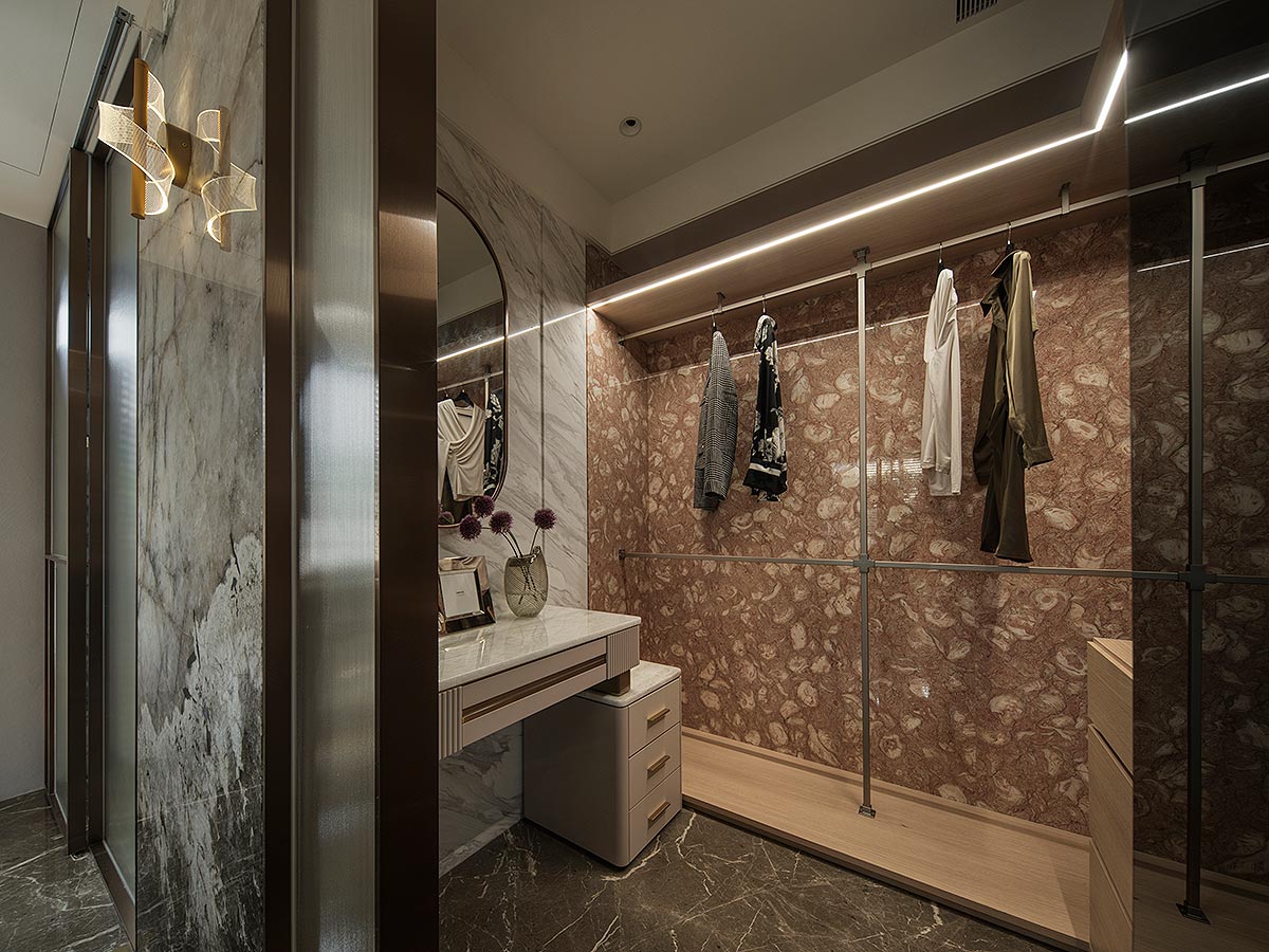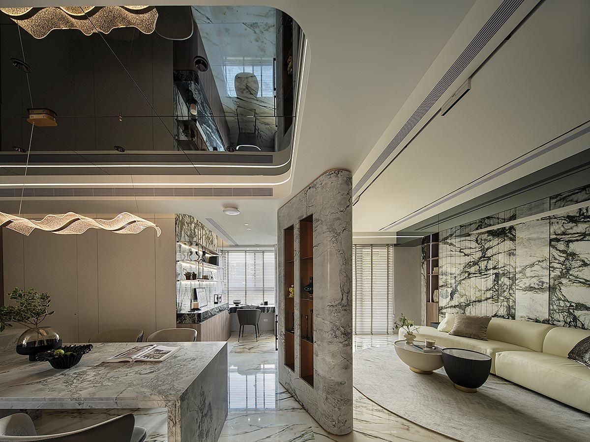 步入廳區,視線隨即被如山水畫般的大理石主牆深深吸引。為了平衡石材的份量感,我們以「石英石」打造電視隔牆,並用「柔弧」收邊化解銳角,讓氣勢成為安定,而非距離;這道圓潤的牆體不僅是視覺焦點,也巧妙整合了機能:一面收藏影音娛樂,一面安放微醺佳釀與談笑的時刻。