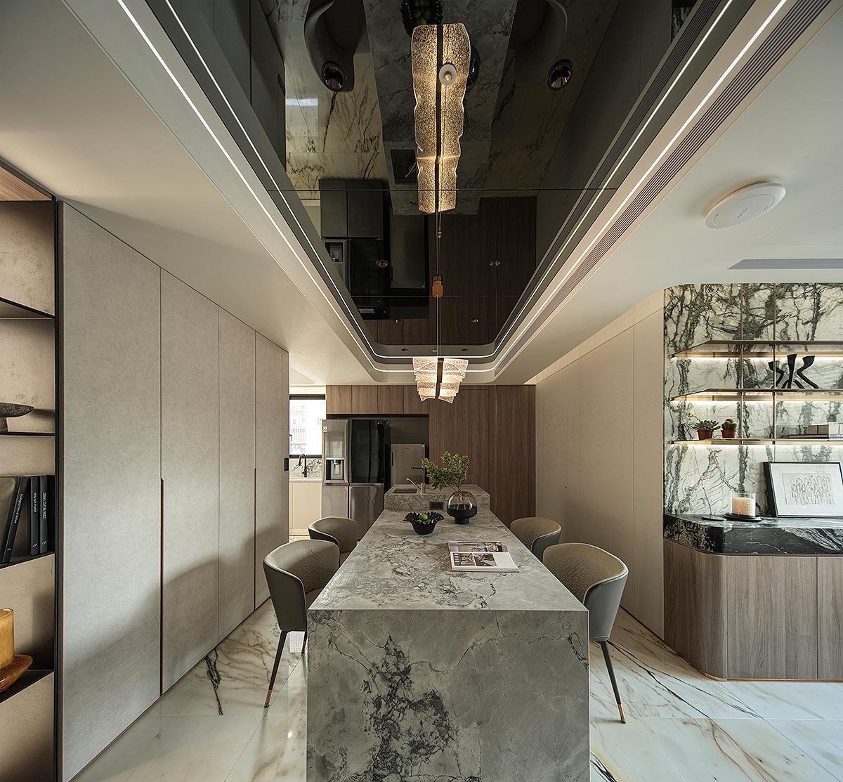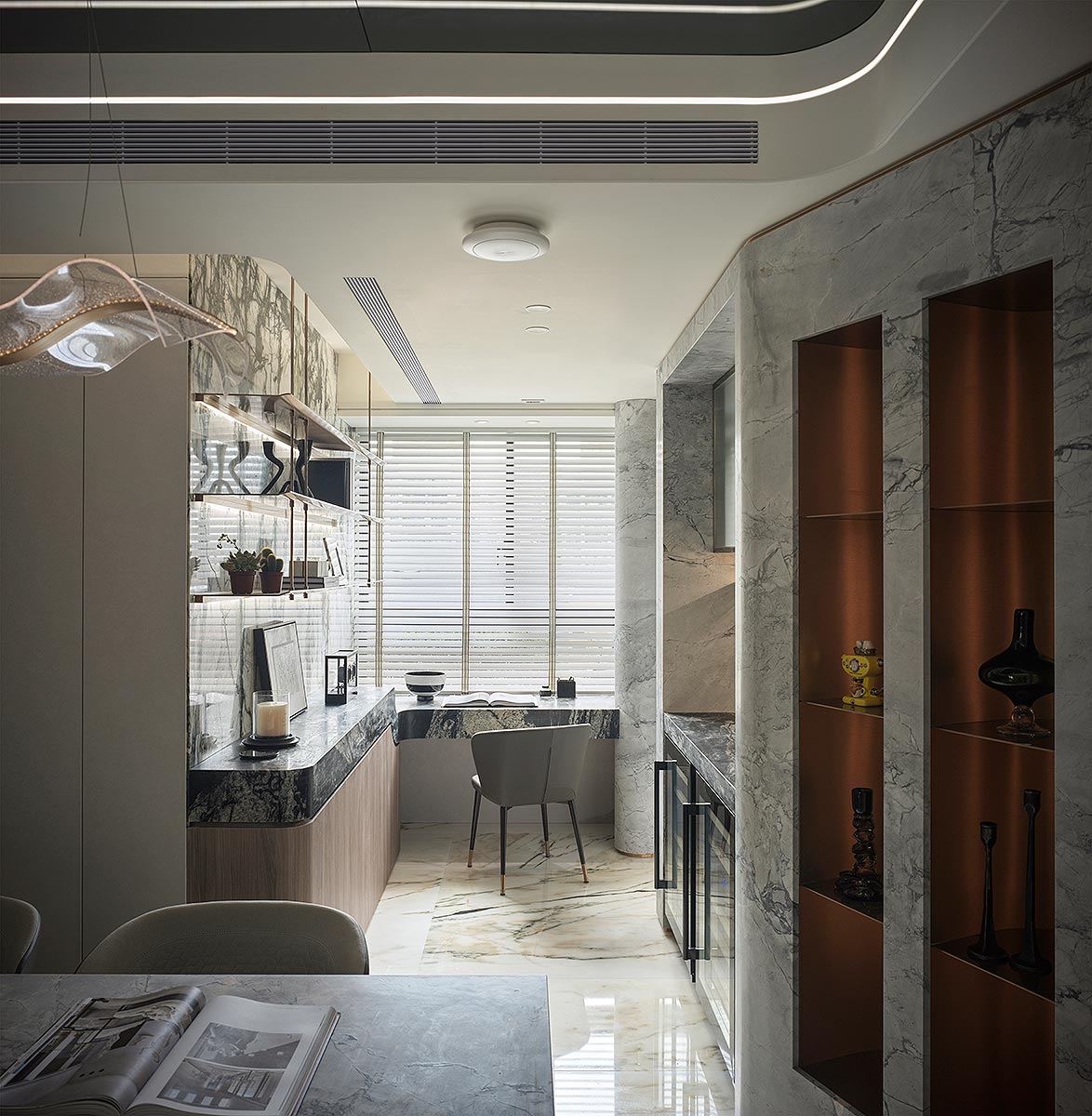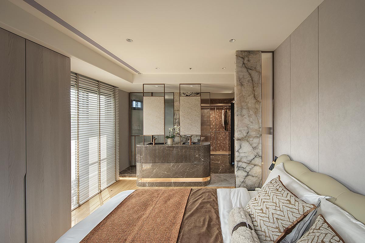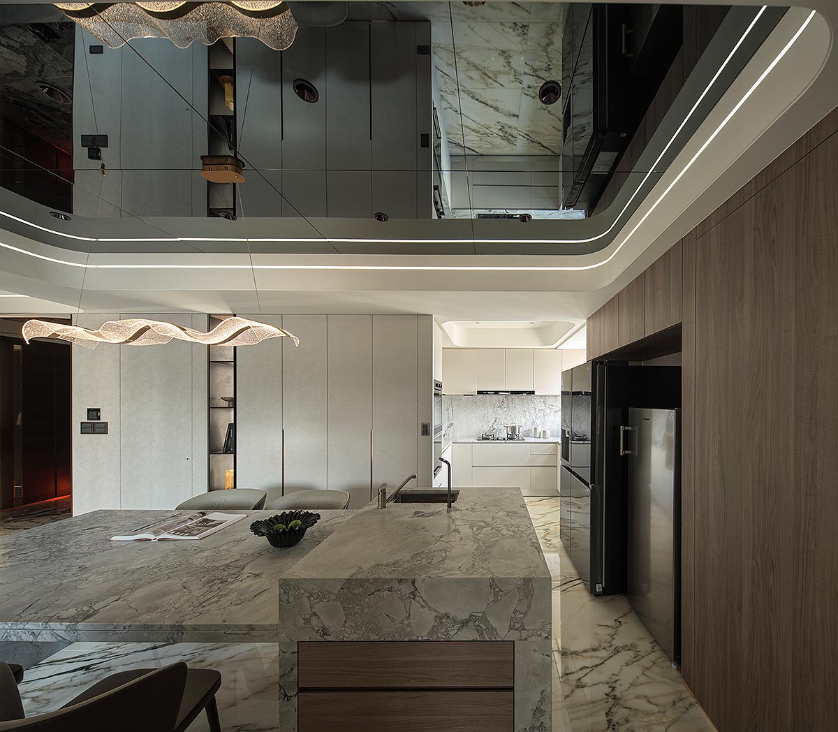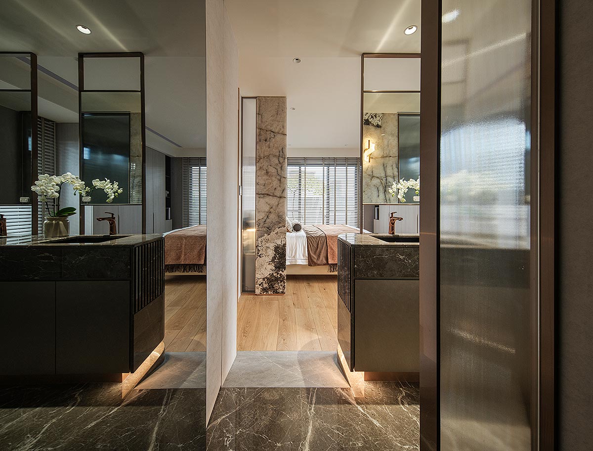步入廳區,視線隨即被如山水畫般的大理石主牆深深吸引。為了平衡石材的份量感,我們以「石英石」打造電視隔牆,並用「柔弧」收邊化解銳角,讓氣勢成為安定,而非距離;這道圓潤的牆體不僅是視覺焦點,也巧妙整合了機能:一面收藏影音娛樂,一面安放微醺佳釀與談笑的時刻。