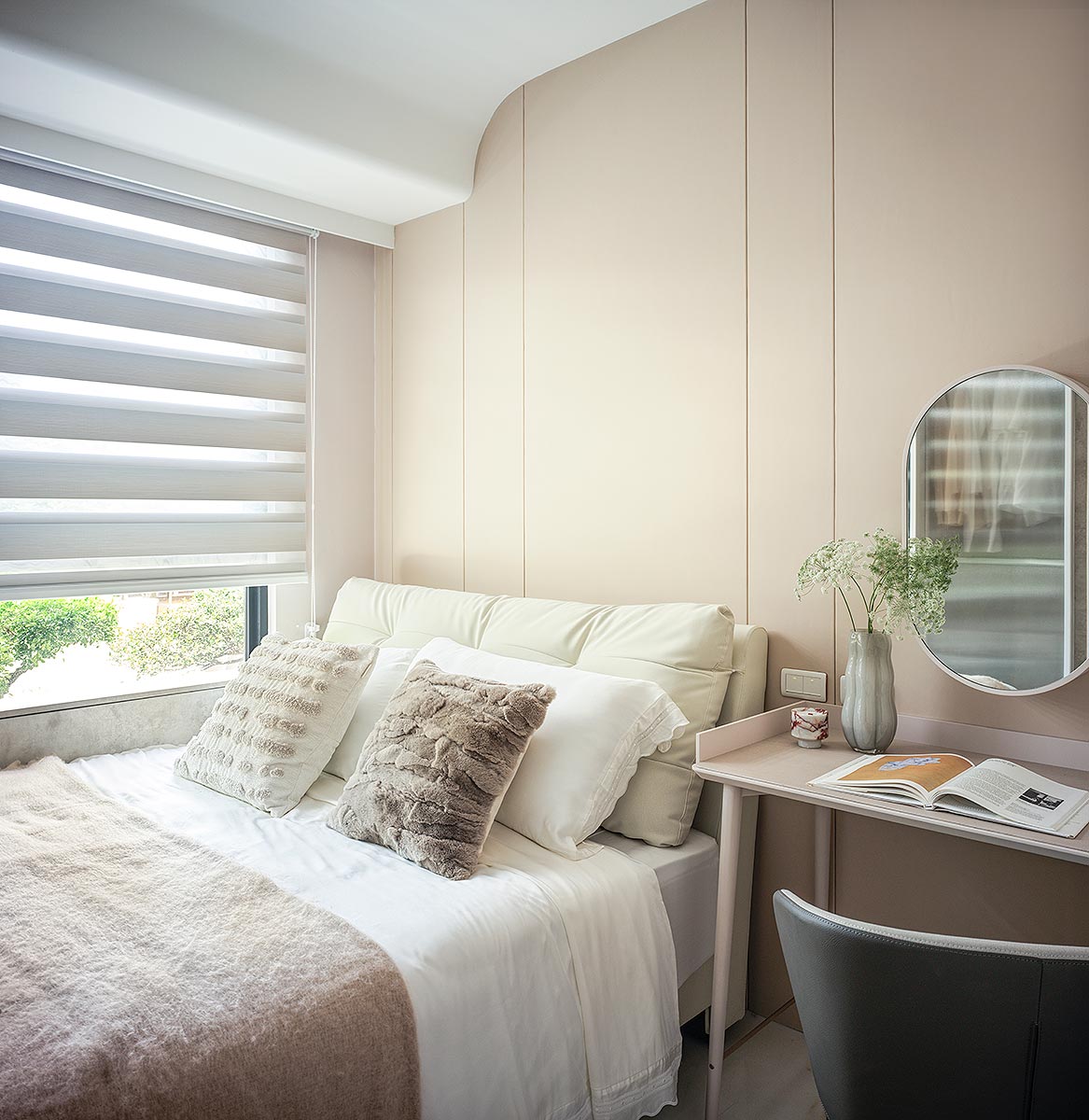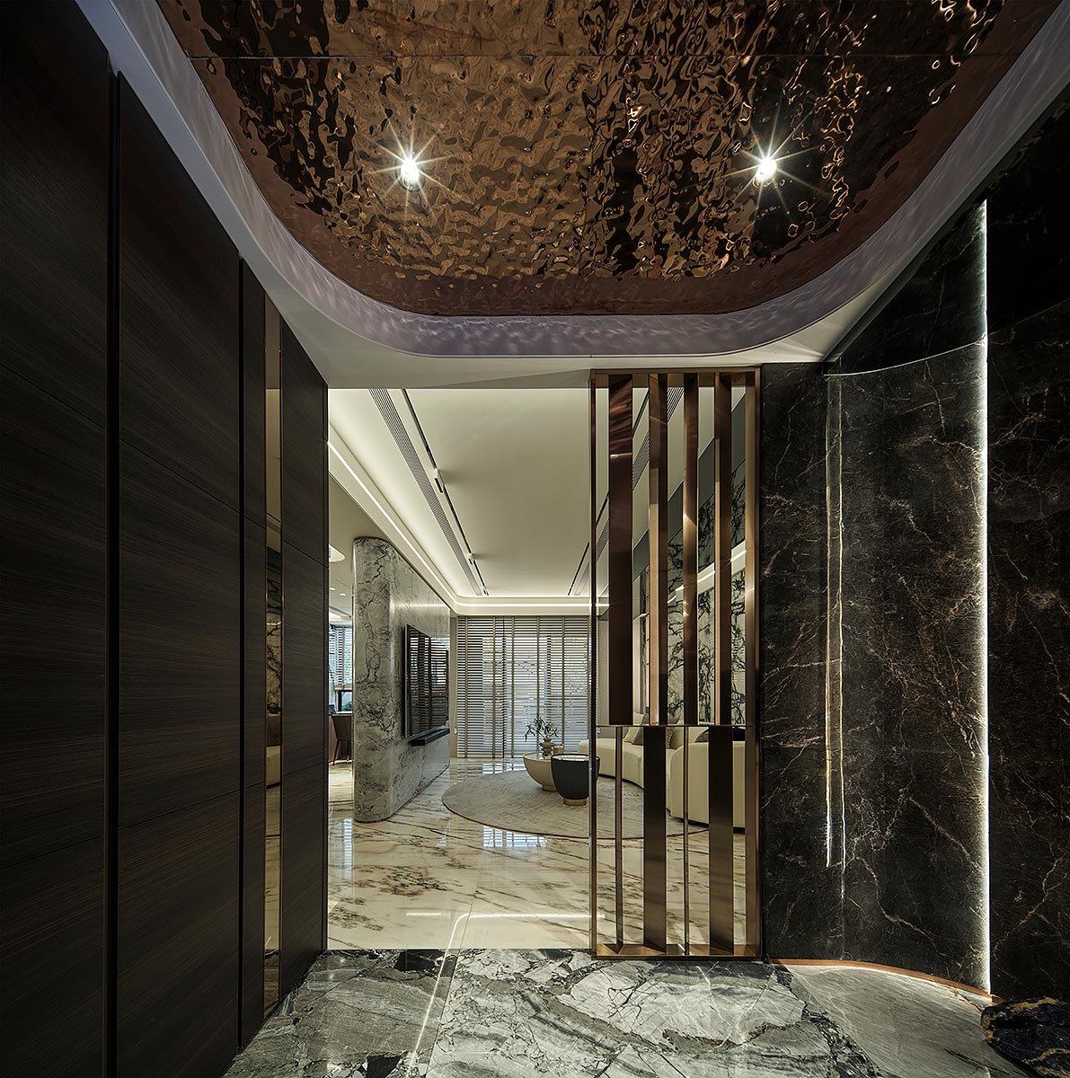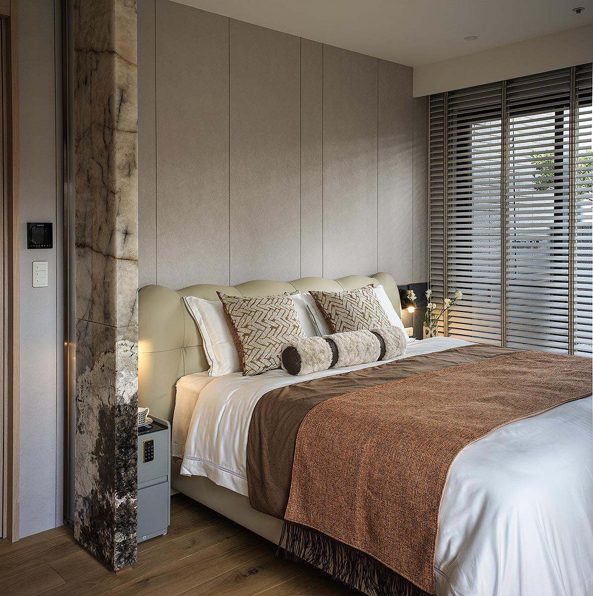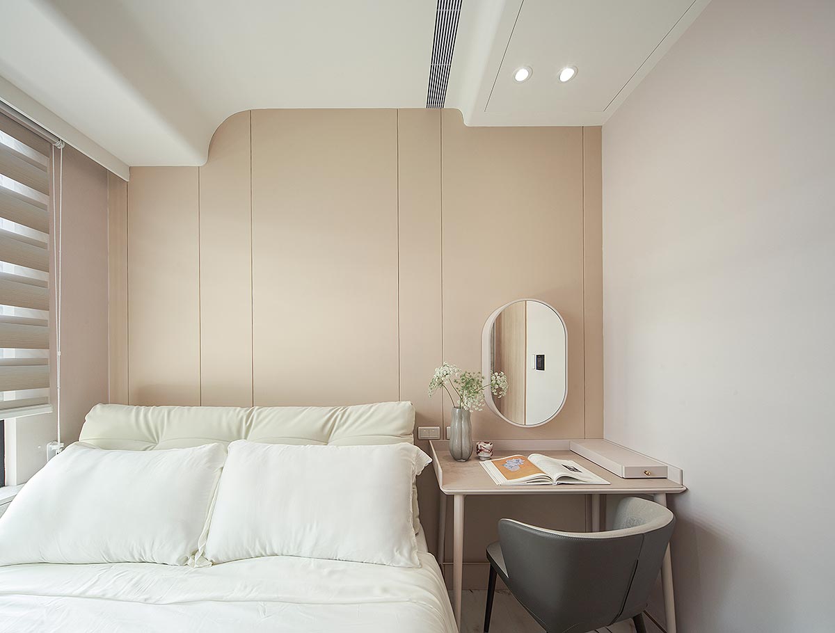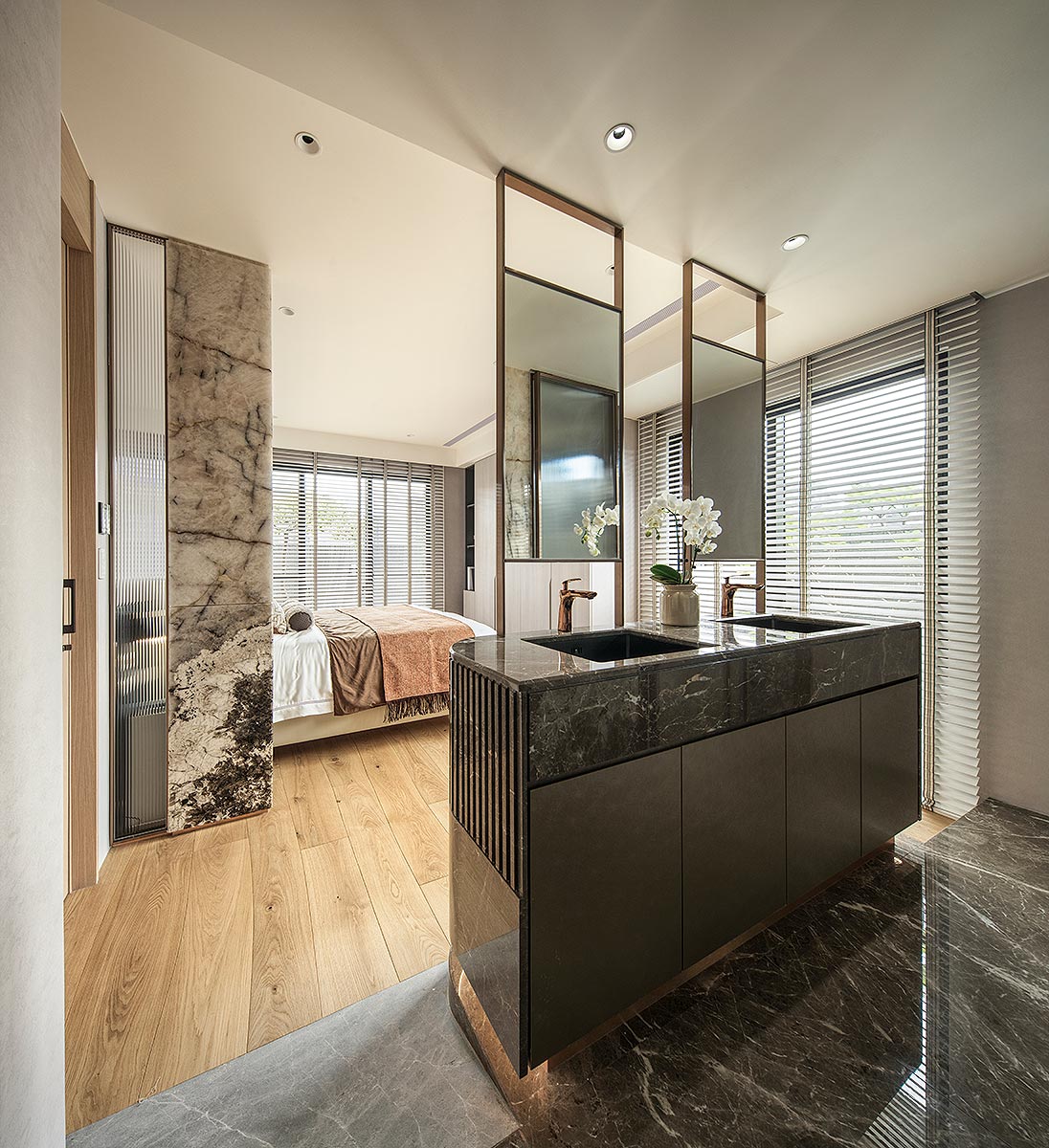 步入廳區,視線隨即被如山水畫般的大理石主牆深深吸引。為了平衡石材的份量感,我們以「石英石」打造電視隔牆,並用「柔弧」收邊化解銳角,讓氣勢成為安定,而非距離;這道圓潤的牆體不僅是視覺焦點,也巧妙整合了機能:一面收藏影音娛樂,一面安放微醺佳釀與談笑的時刻。