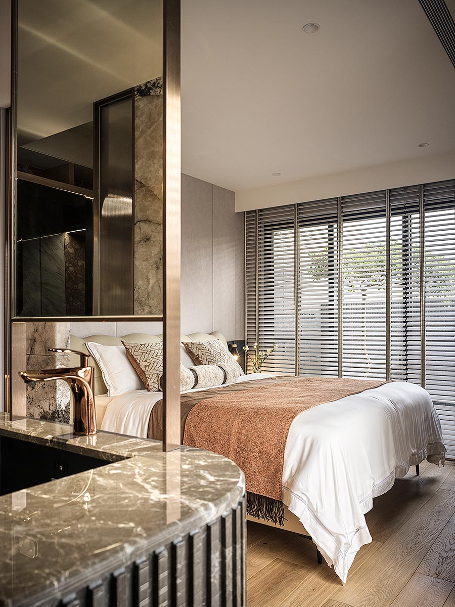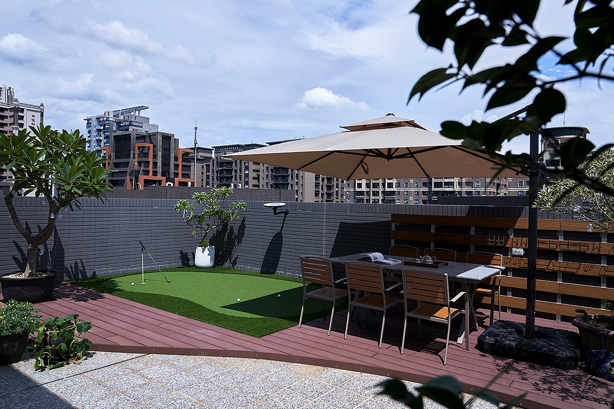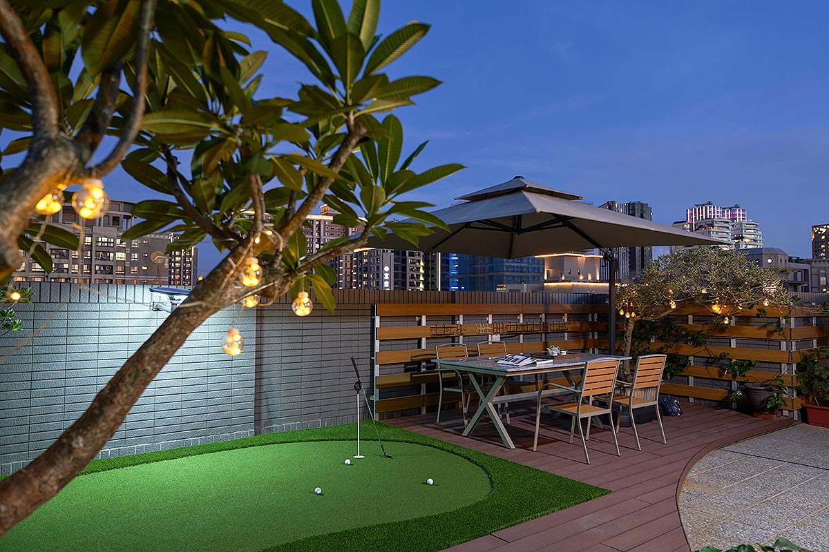 而在這道石牆後方,我們藏入了一方驚喜。隱於場域之後的多功能空間,是男主人閱讀、品酒、沉澱思緒的精神角落;推開落地窗,視野即刻延伸至懸浮於城市之上的私人綠洲,鋪上一方果嶺,佐以植栽綠意。這方天地,既是與摯友揮桿對飲的熱情場域,亦是日暮時分,安放身心的靜謐歸處。