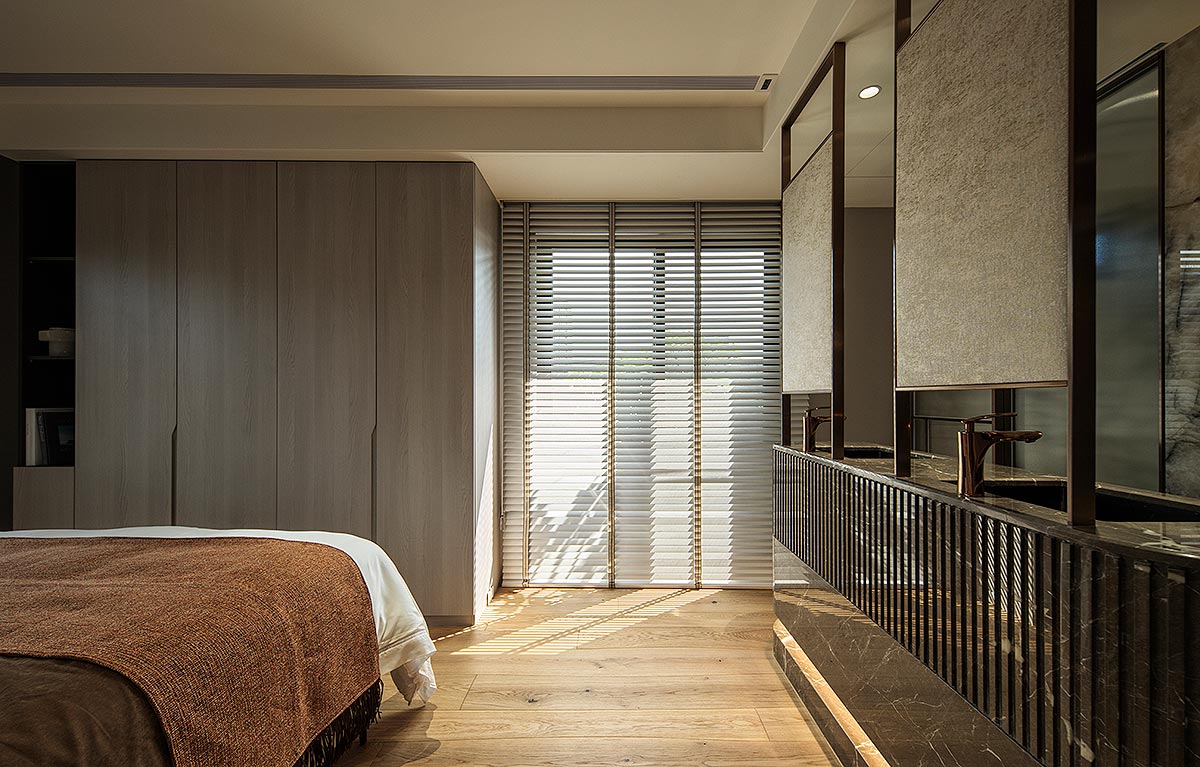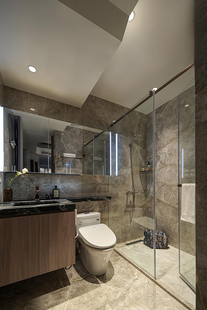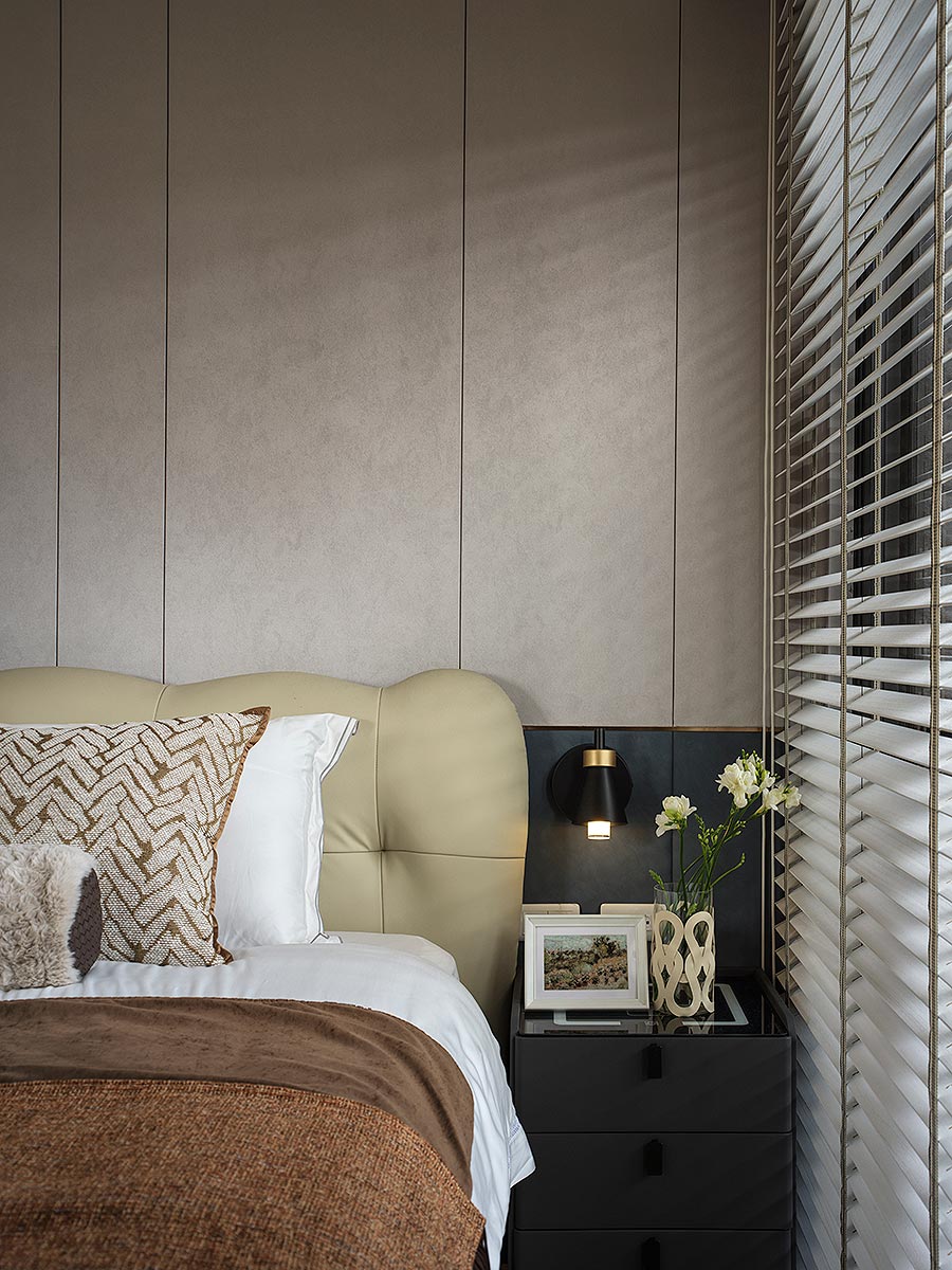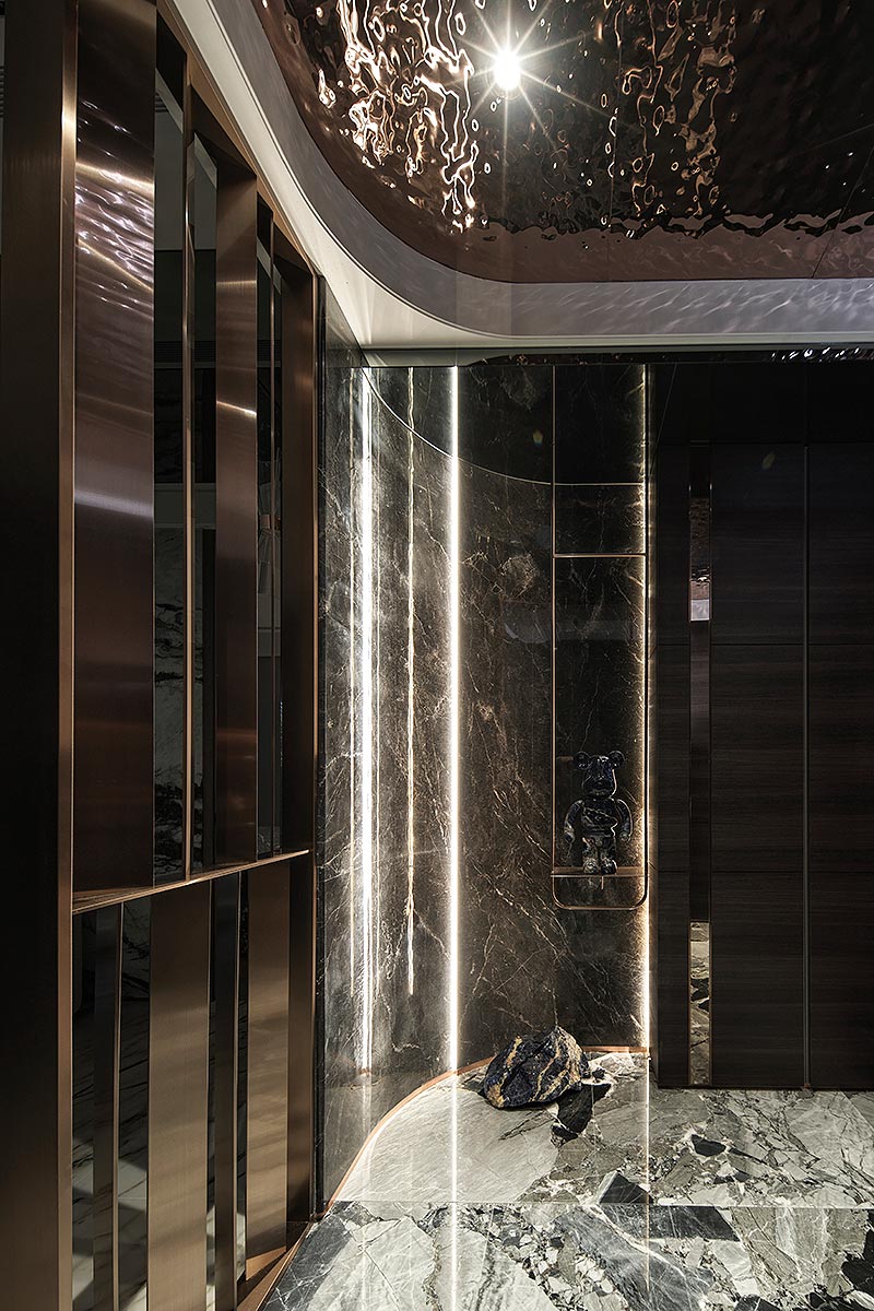 而在這道石牆後方,我們藏入了一方驚喜。隱於場域之後的多功能空間,是男主人閱讀、品酒、沉澱思緒的精神角落;推開落地窗,視野即刻延伸至懸浮於城市之上的私人綠洲,鋪上一方果嶺,佐以植栽綠意。這方天地,既是與摯友揮桿對飲的熱情場域,亦是日暮時分,安放身心的靜謐歸處。