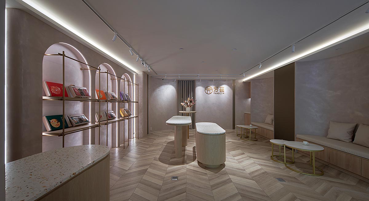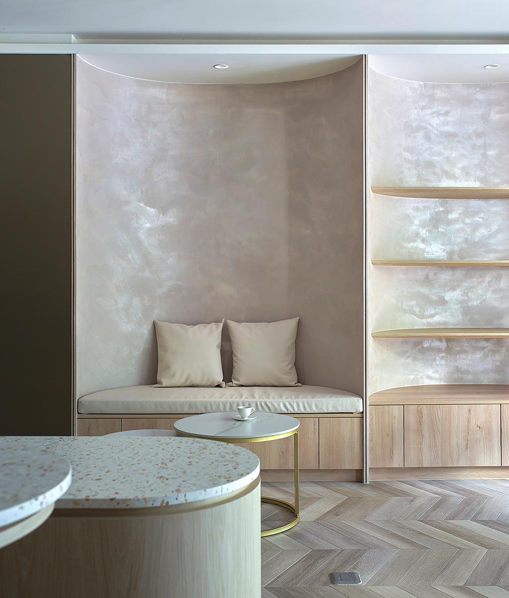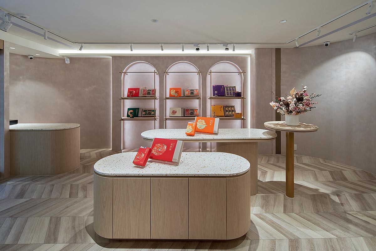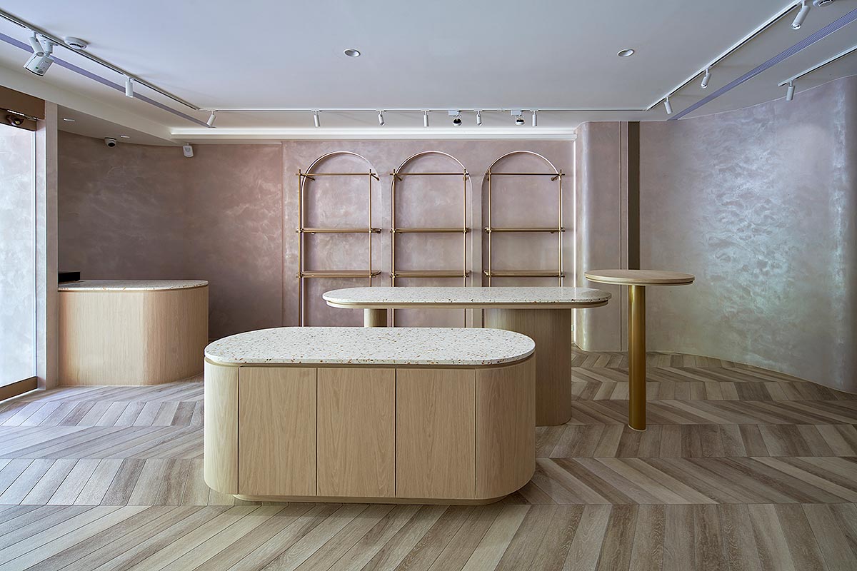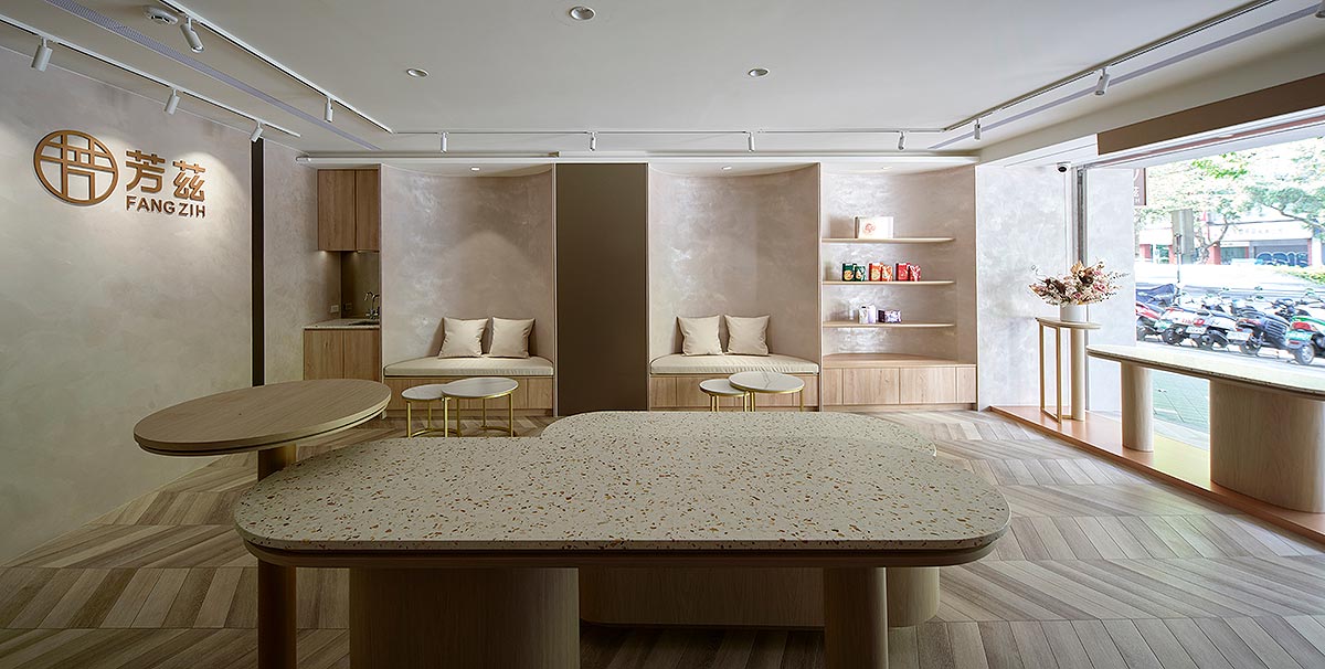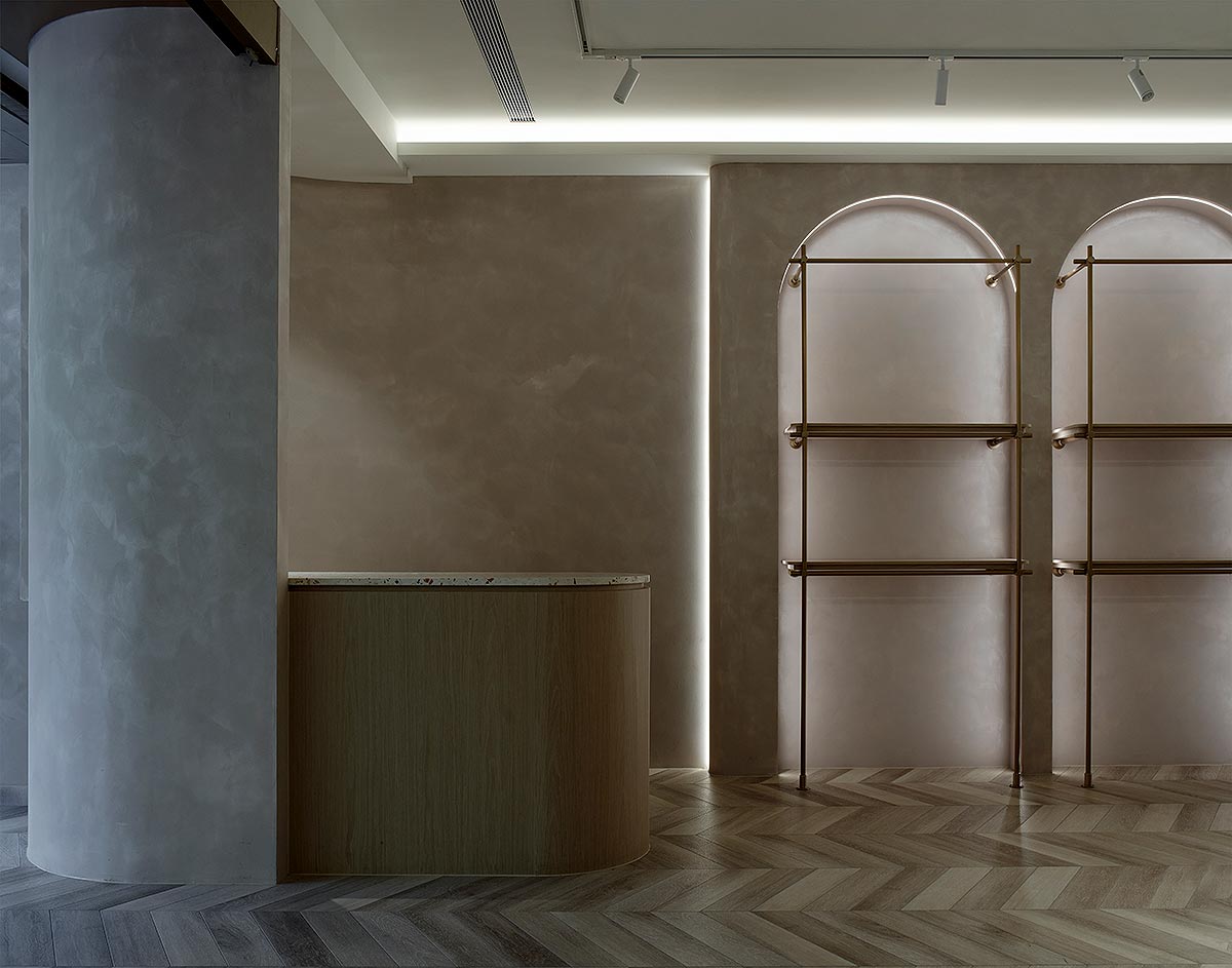 在雙方密切討論彙整需求後,整體空間我們以孕育生命萬物的大地作為設計發想,空間選用溫柔沉靜的大地色系圍塑場域柔美調性,藉由弧形曲線勾勒出優雅圓融的視覺層次,輔搭水磨石與金色元素點綴細節,綻放雅致光影。透過專業設計手法,以女性獨有的敏銳思維量身規劃,打造全台第一家台北旗艦實體門市,以溫馨舒適的體驗氛圍,迎接每一位注重養生健康的消費群眾。