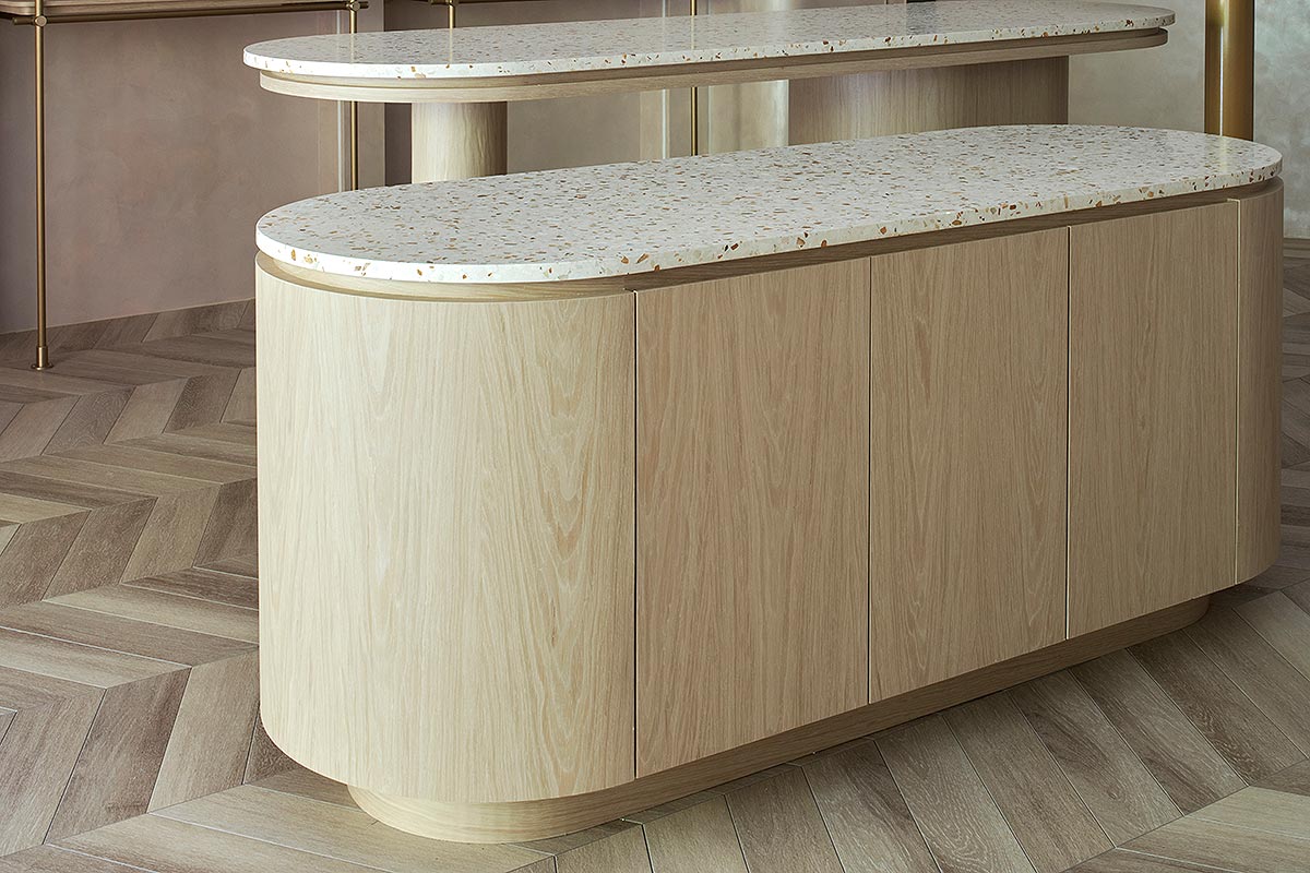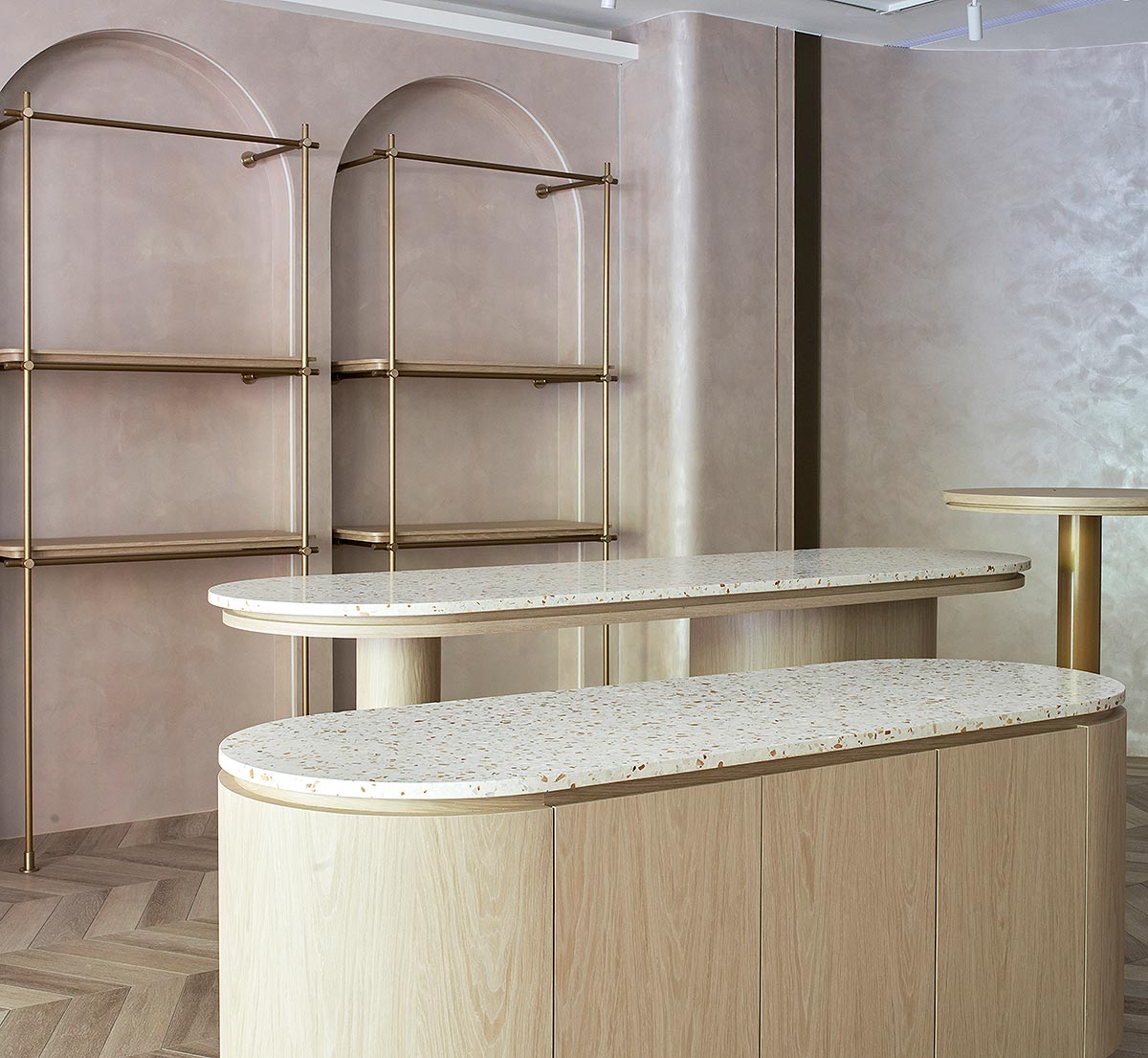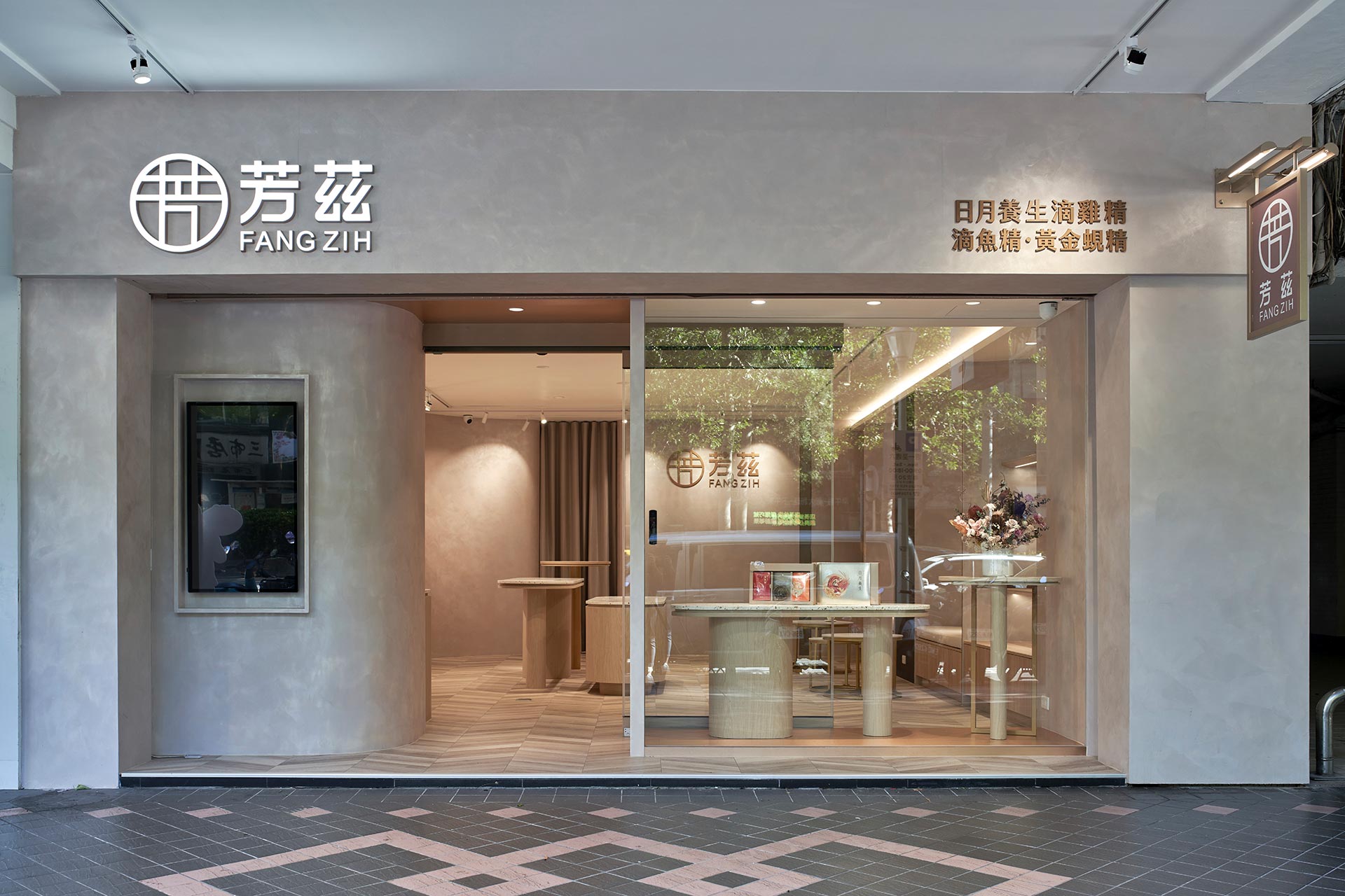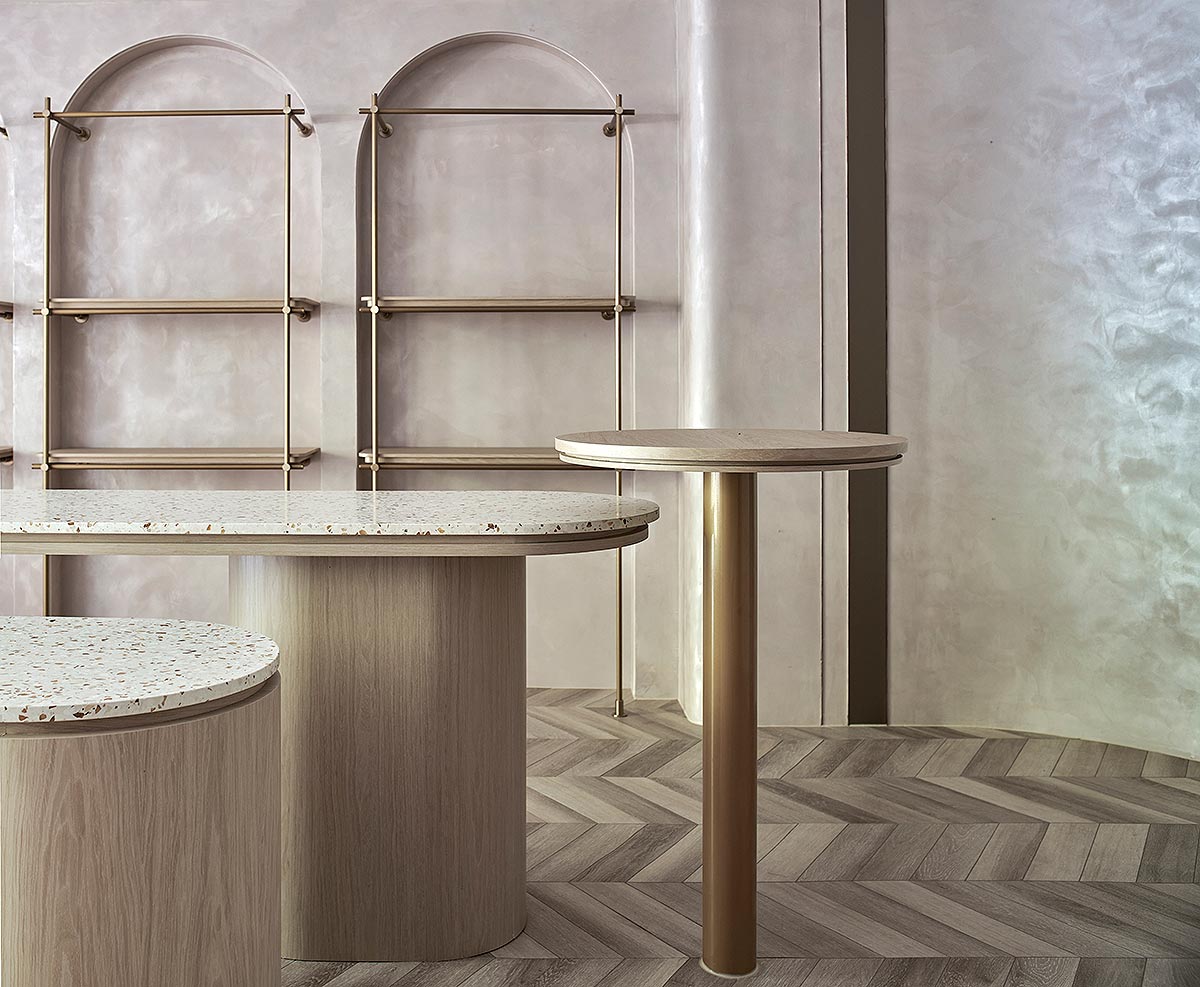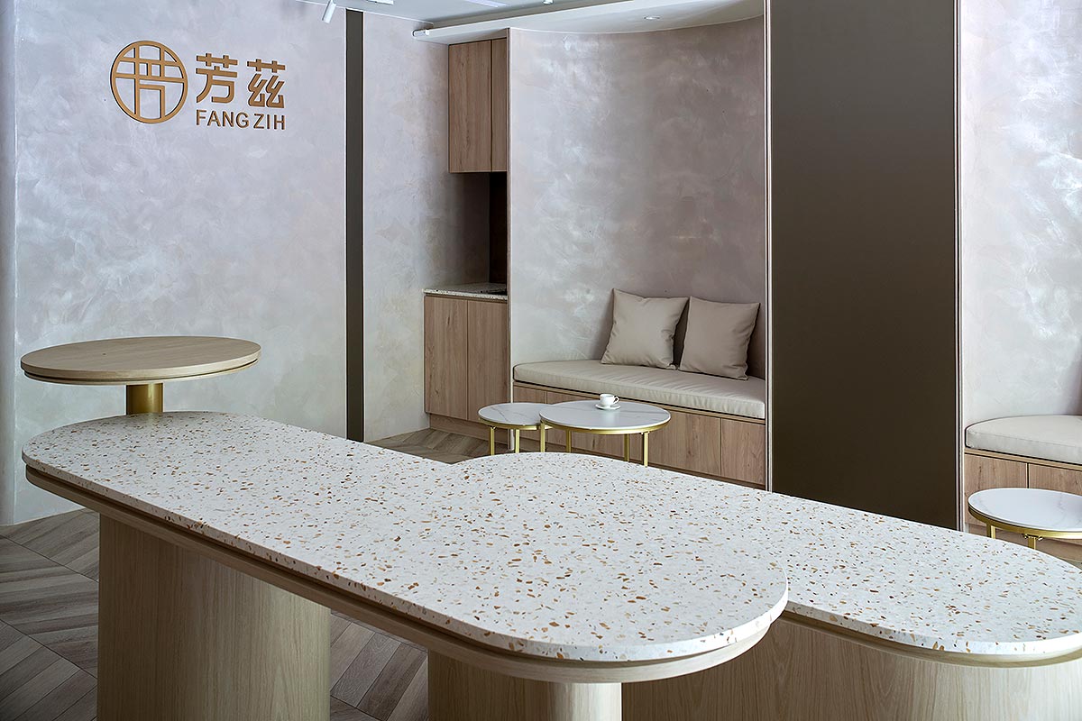在雙方密切討論彙整需求後,整體空間我們以孕育生命萬物的大地作為設計發想,空間選用溫柔沉靜的大地色系圍塑場域柔美調性,藉由弧形曲線勾勒出優雅圓融的視覺層次,輔搭水磨石與金色元素點綴細節,綻放雅致光影。透過專業設計手法,以女性獨有的敏銳思維量身規劃,打造全台第一家台北旗艦實體門市,以溫馨舒適的體驗氛圍,迎接每一位注重養生健康的消費群眾。
