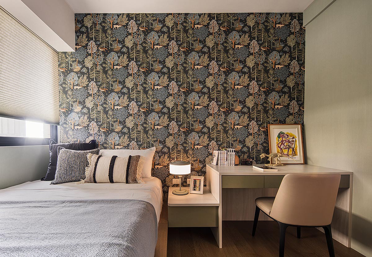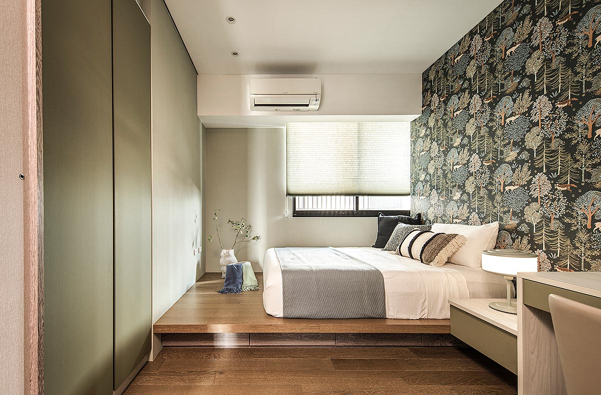 沙發背牆以鍍鈦金屬線條錯落於木質背板之中,隱喻生活美學的秩序與細節控,陽光從落地窗灑落,沿著天花與立面輕柔蔓延,在這樣的空間裡,時間不再急促,而是緩慢、溫柔地流動。