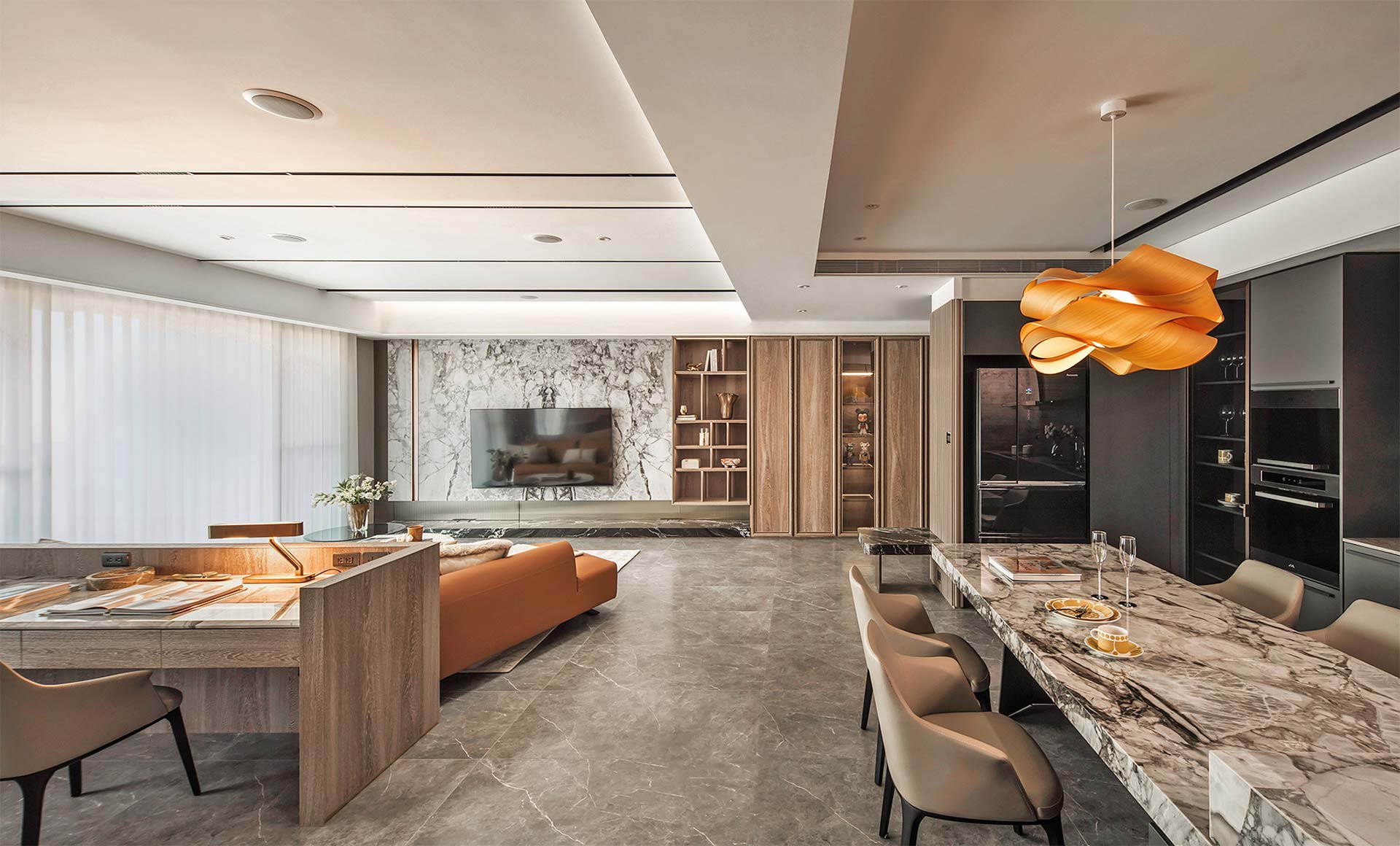 開放式格局串聯了閱讀、會客與餐敘場景,形構一條自然流動的生活軸線,主牆面選用如水墨暈染於雪白石面之上的大理石,為整體空間奠定一種穩重而靜謐的氣韻;地坪鋪陳深灰質地與石紋細節低調卻富層次,映襯主牆肌理,展現呼應自然的設計語言。