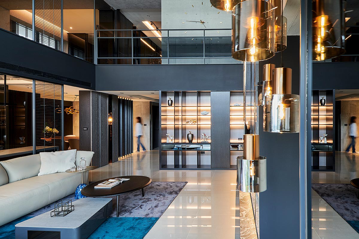 在樓高與光線充足的條件下,將客廳空間維持6米高度,利用紋路絢麗的大理石、清水模及鑲嵌鍍鈦金屬線條,為空間挹注細膩與粗獷的衝突美感。